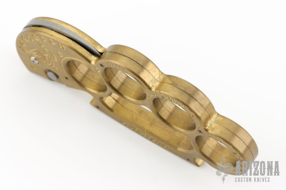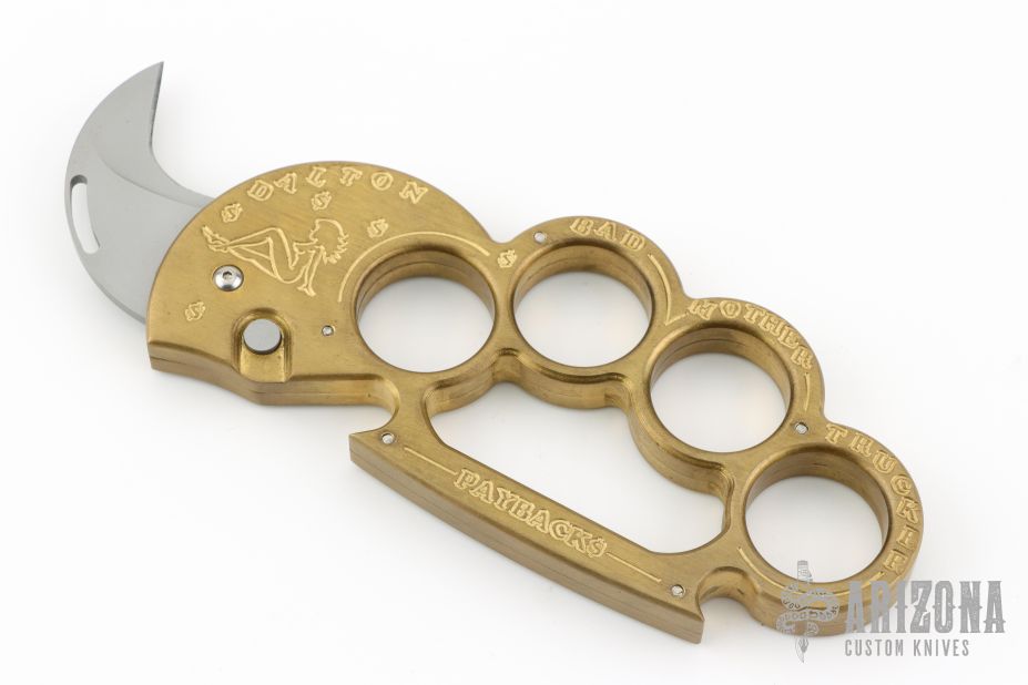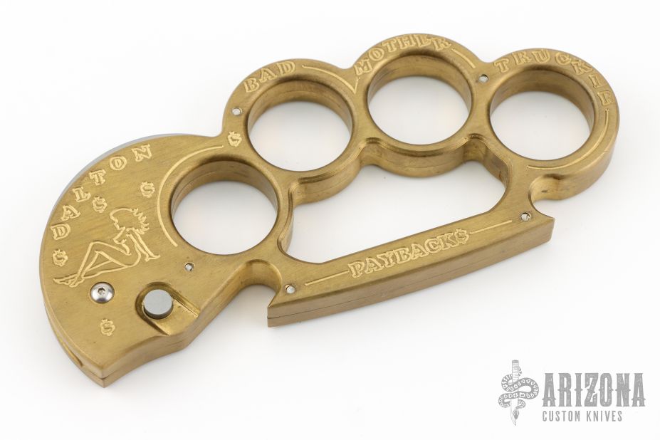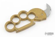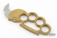 This BMF Interrogator by Rob Dalton is a set of brass knuckles with a small claw automatic blade on the thumb side. Bead blasted blade with 1" cutting edge. 1 1/16" diameter finger holes. Made of brass for that heavy duty feel. Perfect function. Says "Bad Mother Trucker" and " Paybacks a Bitch" on handle. Has a couple light scratches, otherwise excellent condition.