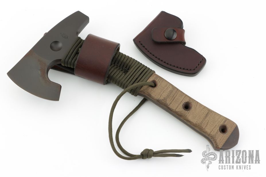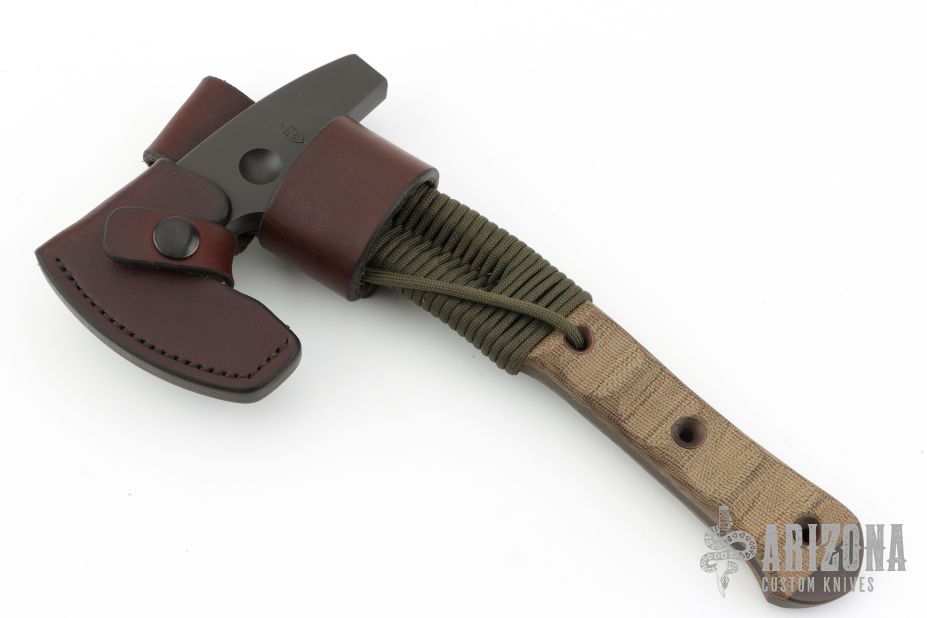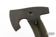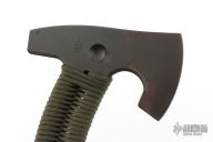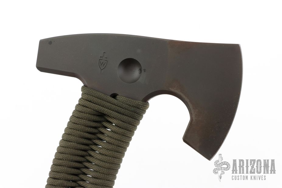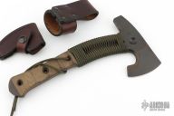 This Wiglaf Hawk by Wenger Blades features a black Caswell finished blade with hammer pole, .387" blade stock, 2.75" blade length, 5" from blade edge to hammer pole, full integral tang construction. This is built like a true integral, with recessed inlays. Has OD Green paracord wrap and OD Green canvas micarta inalys. Comes with a brown leather sheath and a brown leather frog. Comes with COA dated 9-28-2020. Has some light oxidation on the blade, otherwise excellent condition. Appears completely unused.