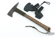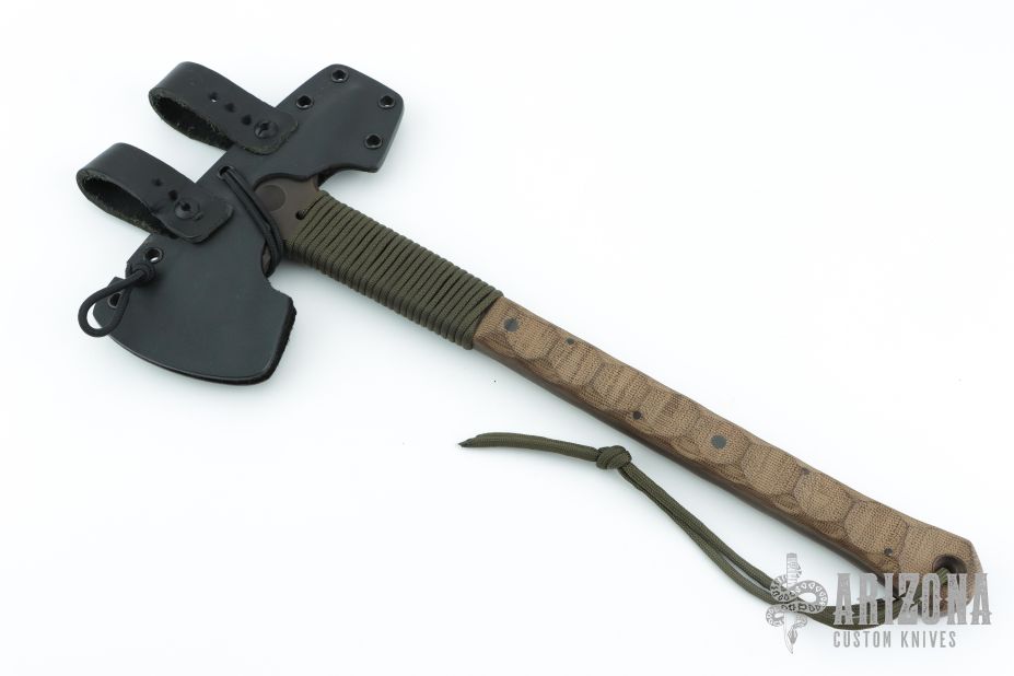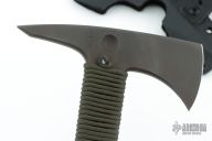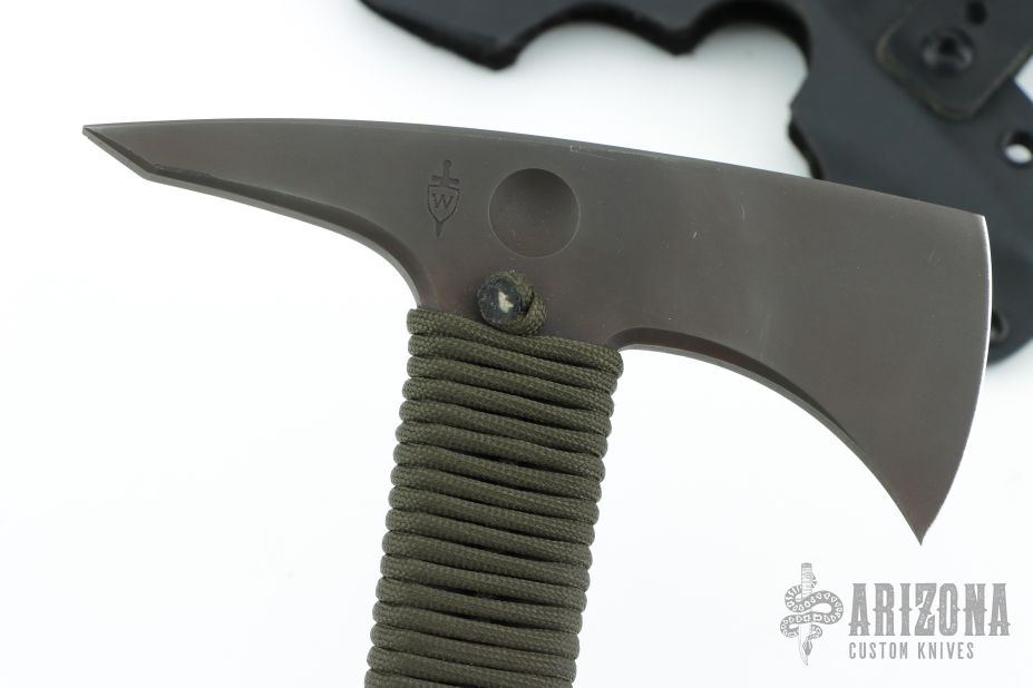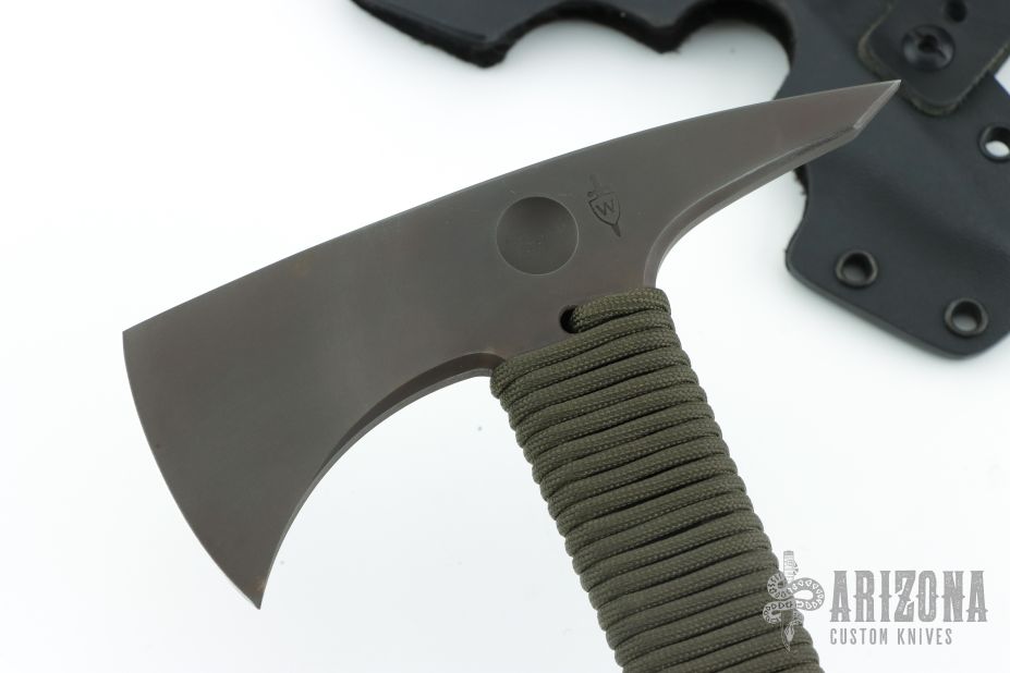 This Loki Hawk by Wenger Blades features a black Caswell finished blade with spike pole, .390" blade stock, 2.25" blade length, 6" from blade edge to spike tip, full integral tang construction. This is built like a true integral, with recessed inlays. Has OD Green paracord wrap and OD Green canvas micarta inalys. Comes with a kydex sheath. Comes with COA dated 9-28-2020. Has some light oxidation on the tang, has some light scratches, otherwise excellent condition. Appears completely unused.