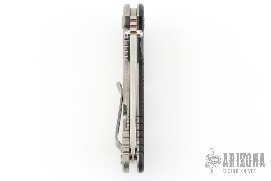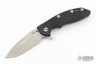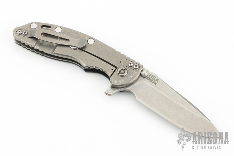 This XM-18 Slicer by Rick Hinderer Knives features a 3.5" stonewash finished blade, notched thumbrest and dual thumbstuds. The handle has a black G-10 scale, and stonewashed titanium handle/clip. Clip can be mounted for tip up or down carry. Nice detent, lockup, and detent. Comes with original box and card. Has a couple light scuffs, excellent condition otherwise.