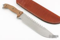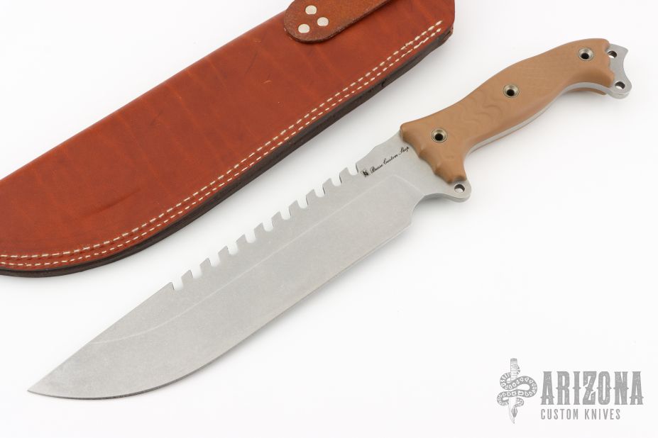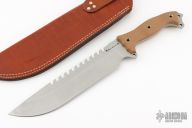 This Fusion Battle Saw by Busse Knives has a stonewash finished blade with 10 saw teeth on the spine, large finger choil, .209" blade stock, 2.078" depth, full tang construction. The handle has coyote brown G-10 scales, exposed butt tang with lashing points. Comes with a brown leather sheath. Excellent condition.