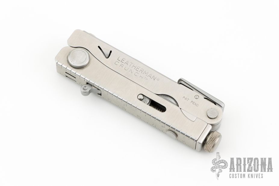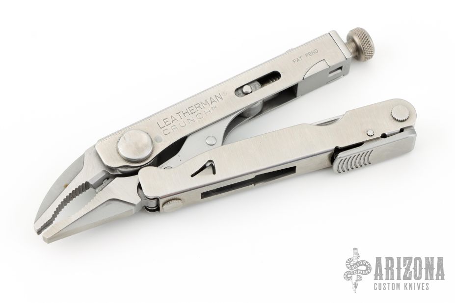 A compact, 4-inch multitool with 15 all-locking tools, foldable pliers and more. The Crunch clamps up to a 1-inch diameter pipe, and if you remove the adjusting screw, you'll find a hex-bit adapter built right in. With locking blades that release with the push of a button, the Crunch will take a bite out of any job. Closed Length: 4 in (10 cm); Weight: 6.9 oz (196 g); Blade Length: 2.2 in (5.5 cm).