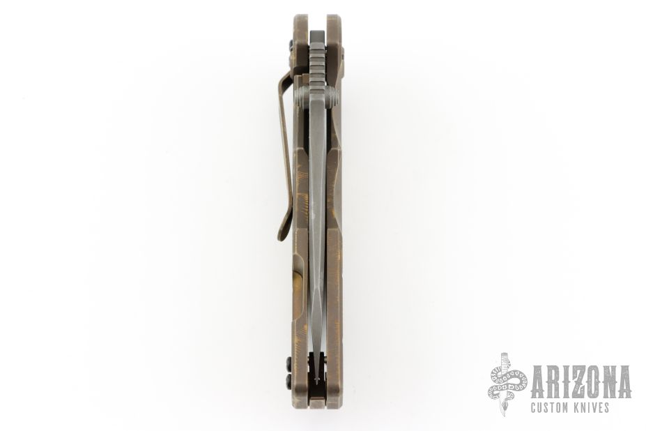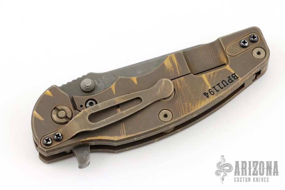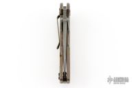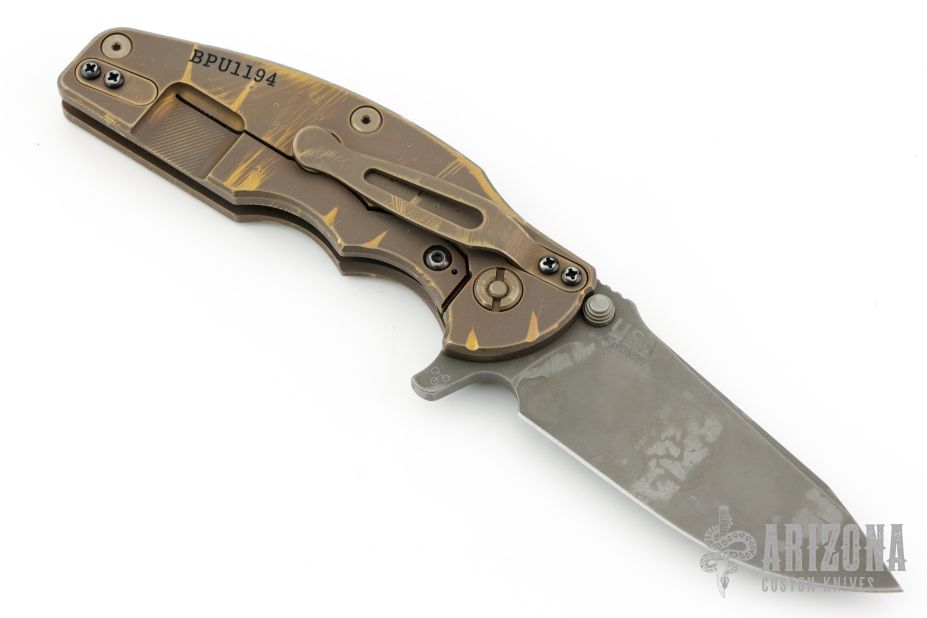 This Jurassic by Hinderer Knives features a clip point blade with notched thumbrest and flipper. The handle has a distressed titanium frame with a tip up or down reversible clip and a modular backspacer. Nice detent, lockup and blade seating. This knife has the Tri-Way pivot system. Comes with original box, card, and extra washers. Excellent condition. #1194