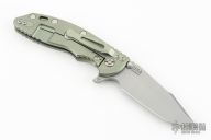 This Battle Hound XM-18 3.5" flipper by Rick Hinderer features a bead blast finished blade with notched thumbrest and flipper. The handle has a bead blast and anodize finished titanium frame with a tip up or down reversible titanium clip and filler tab, lanyard hole at the butt. Comes with original box and extra washers. Excellent condition.