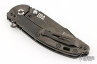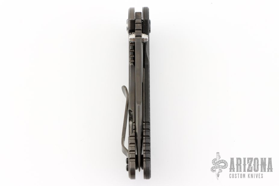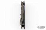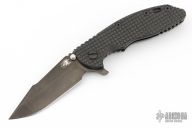 This 3.5" XM-18 from Rick Hinderer features a DLC finished blade with notched thumbrest and flipper. Frag pattern carbon fiber scale and battle black titanium frame and pocket clip. Dual thumb studs and notched thumb rest. Reversible pocket clip. Strong lock up, nice detent and blade seating is center. Includes an unlabeled white box. Excellent condition.