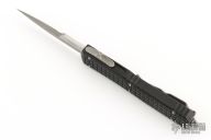This knife from Microtech was the 2023 Blade Show Special. It has a double edged bayonet ground blade with an Apocalyptic finish. The handle is black frag pattern G-10 and black aluminum with a tip down Apocalyptic stainless clip and glass breaker at the butt. Comes with an original box and papers. Has a couple light scuffs, otherwise excellent condition. Dated 06/2023