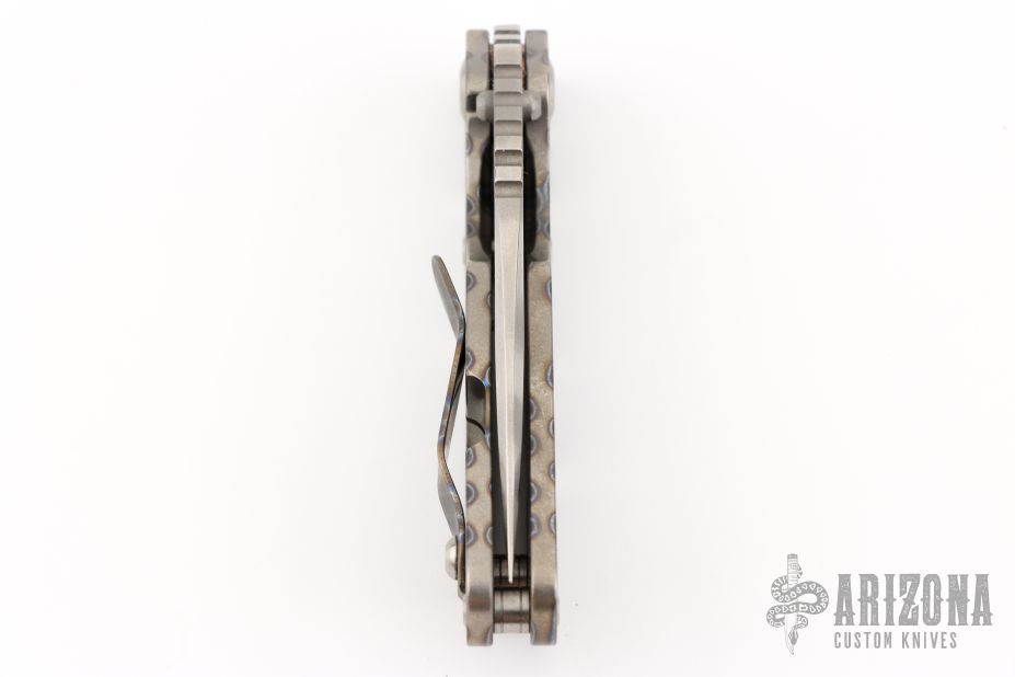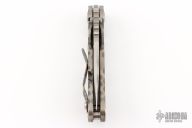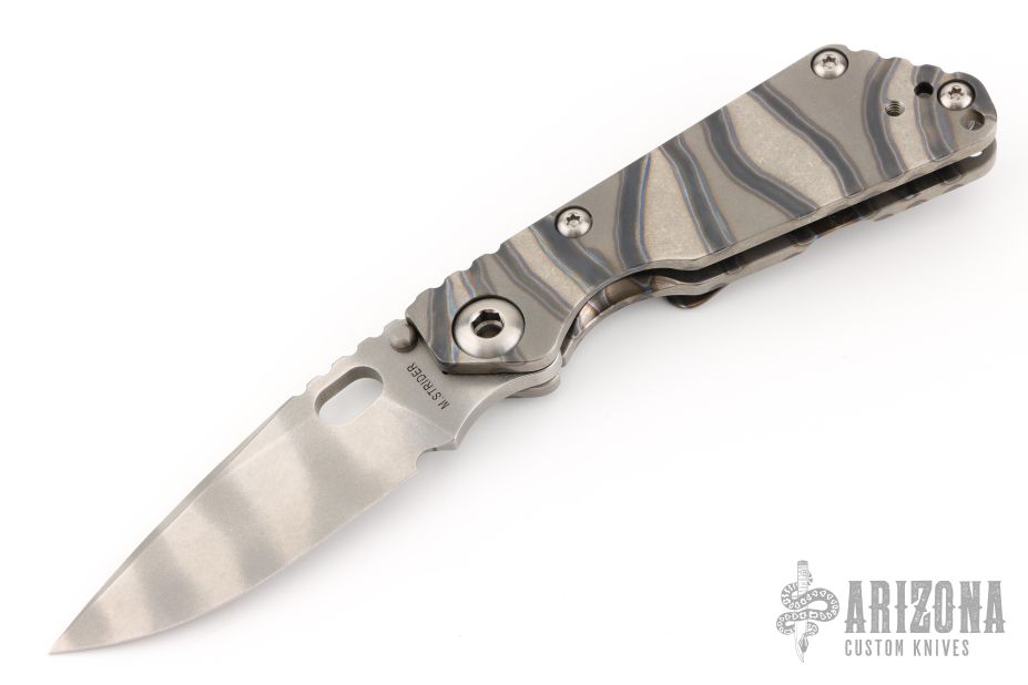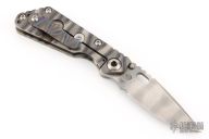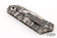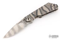 This JVA by Mick Strider is larger than a PT, but smaller than an SNG. It features a ghost striped blade with notched thumbrest and thumbhole. The handle has a flame finished titanium frame with matching tip up clip. Excellent Condition.