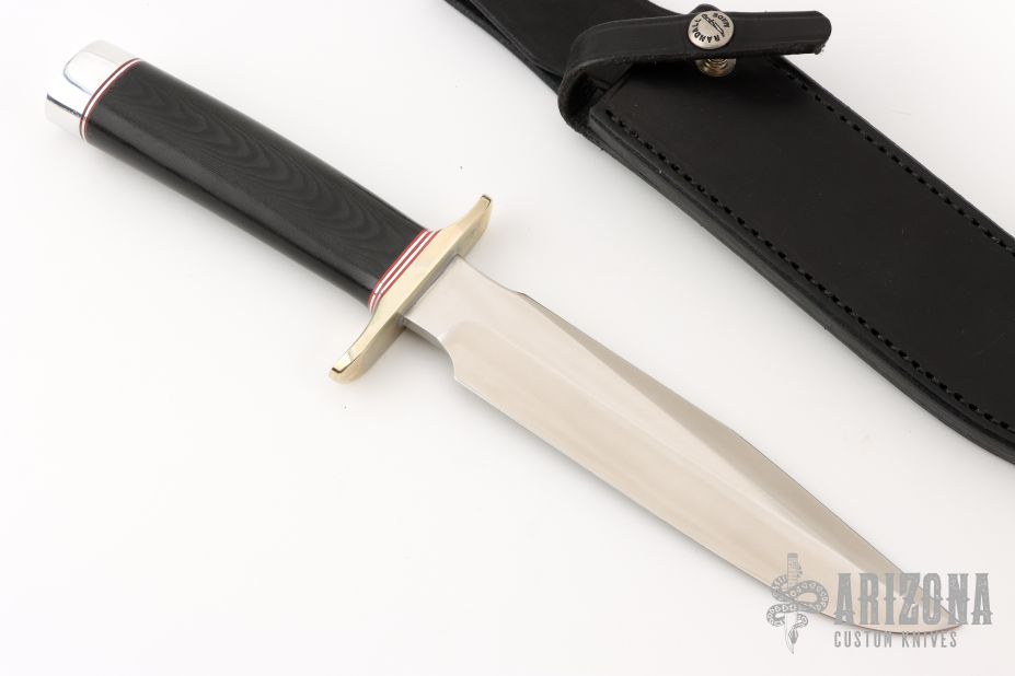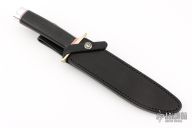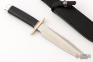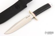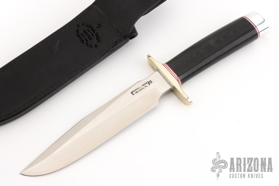 This Model 1-7 from Randall Made Knives features a satin finished clip point blade with sharpened top edge, .226" blade stock and 1.326" blade depth, hidden tang construction. The handle is comprised of a nickel silver guard, red/duralumin spacers, black linen micarta handle and duralumin pommel. Comes with black leather sheath. Excellent condition.