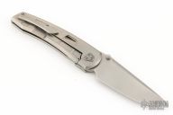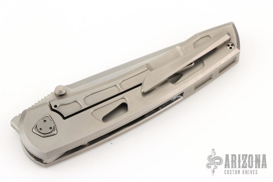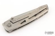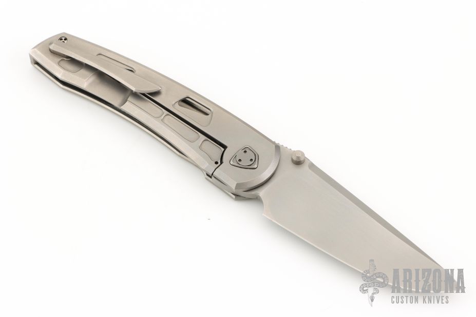 This Waka by Edison Barajas features a zinc blasted blade with notched thumbrest and dual thumbstuds, can be front flipped. The handle has a milled and zinc blasted titanium frame with matching backspacer and tip up clip with hidden screws. Has custom pivot. Rides on bearings, nice detent, lockup and blade seating. Comes with original box and COA. Excellent condition.