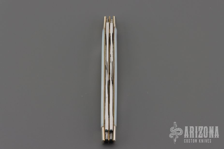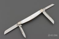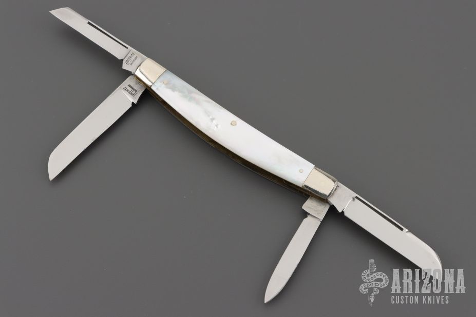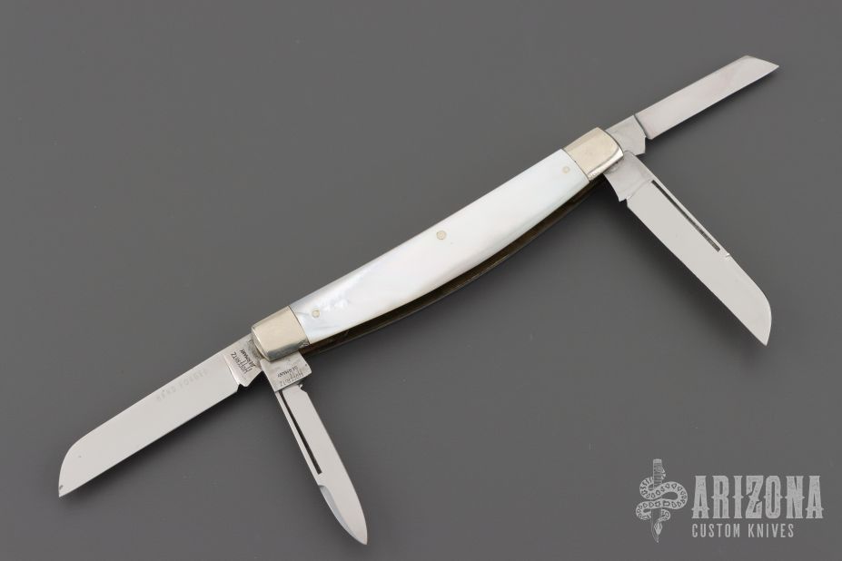 This 4-blade congress by Hoffritz features mirror polished blades with nail nicks. The handle has nickel silver bolsters, mother of pearl covers, brass liners and stainless steel springs. Has half-stops, flush in all positions. Has some light scratches, otherwise excellent condition.