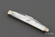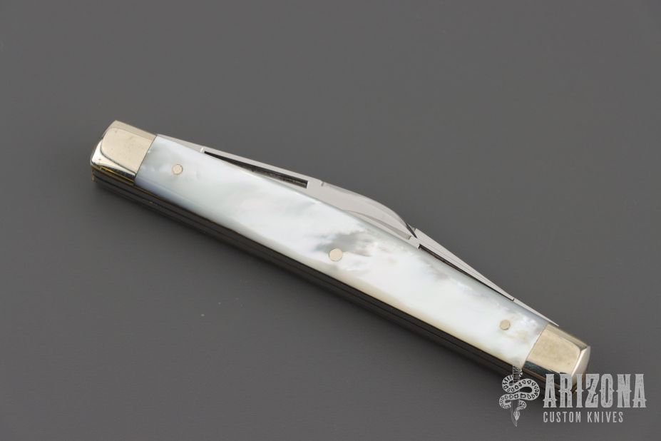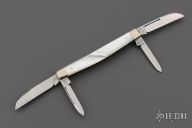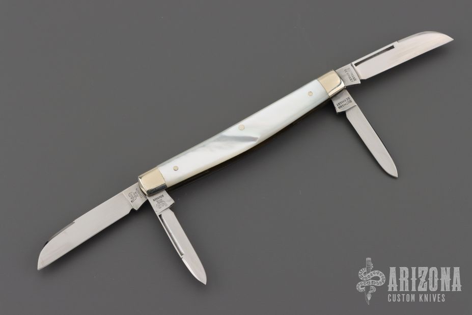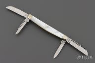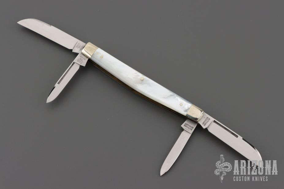 This 4-blade congress by Hen and Rooster features mirror polished blades with nail nicks. The handle has nickel silver bolsters, mother of pearl covers, brass liners and stainless steel springs. Has half-stops. Has some light scratches, otherwise excellent condition.