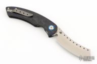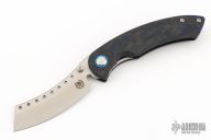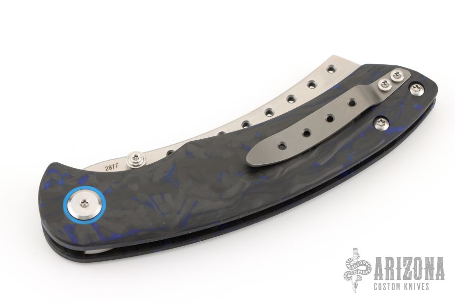 The Red Horse Knife Works Hell Razor P features a satin finished blade with dual thumbstuds and a notched thumbrest. The handle has carbon fiber scales with blue G-10 pivot collars, inlaid stainless steel liners, tip up bead blasted titanium clip. Excellent condition. #2877