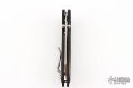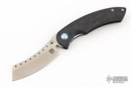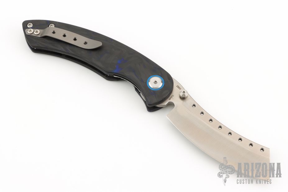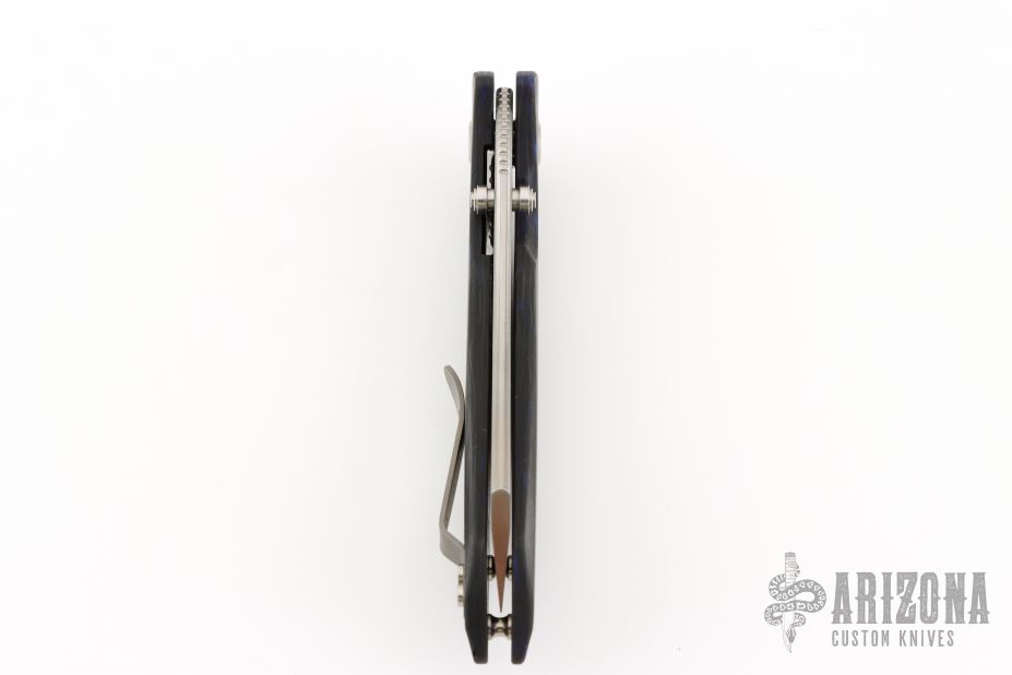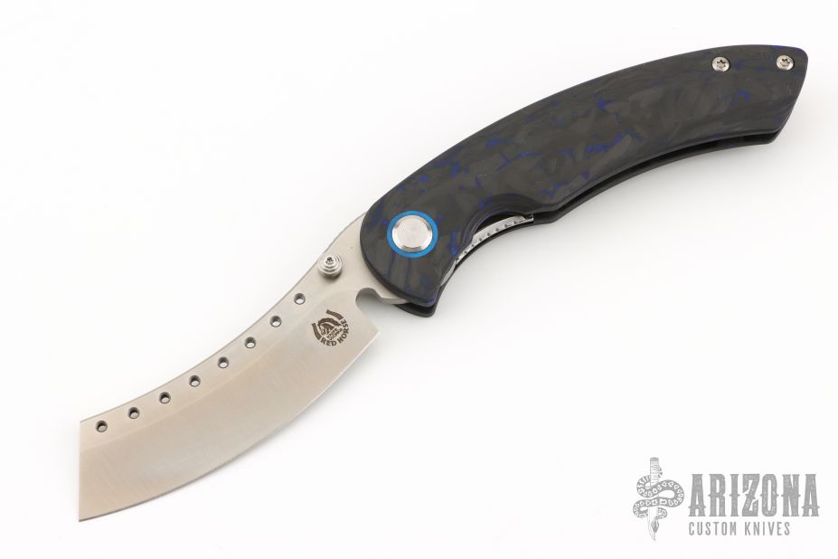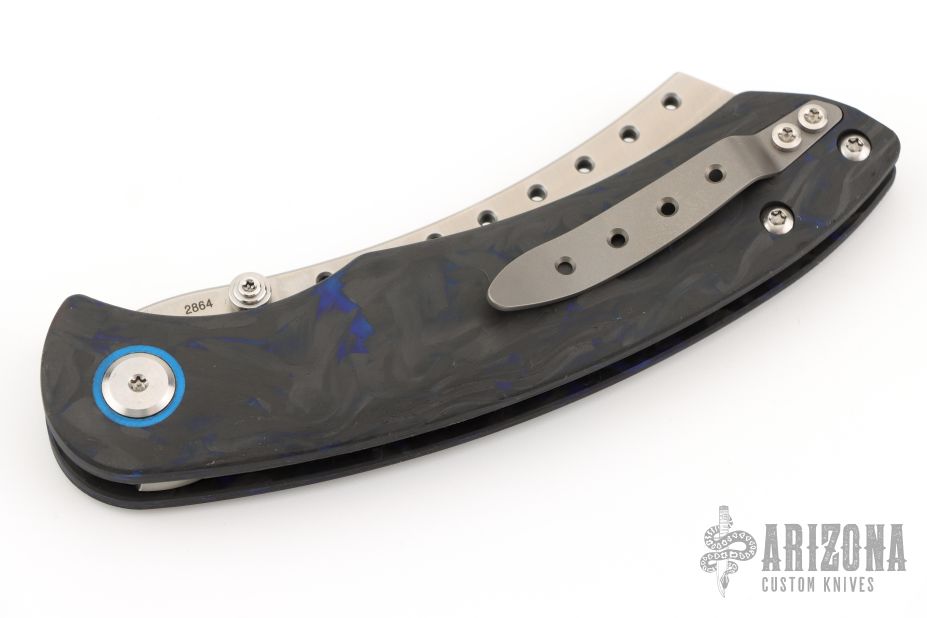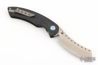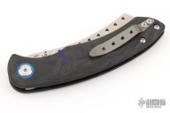 The Red Horse Knife Works Hell Razor P features a satin finished blade with dual thumbstuds and a notched thumbrest. The handle has marble carbon fiber scales with blue G-10 pivot collars, inlaid stainless steel liners, tip up bead blasted titanium clip. Excellent condition. #2864