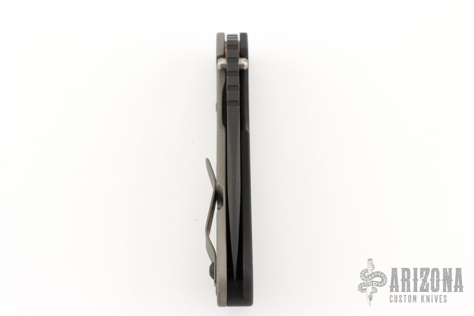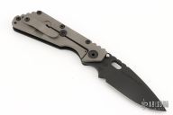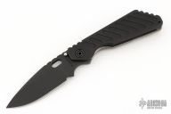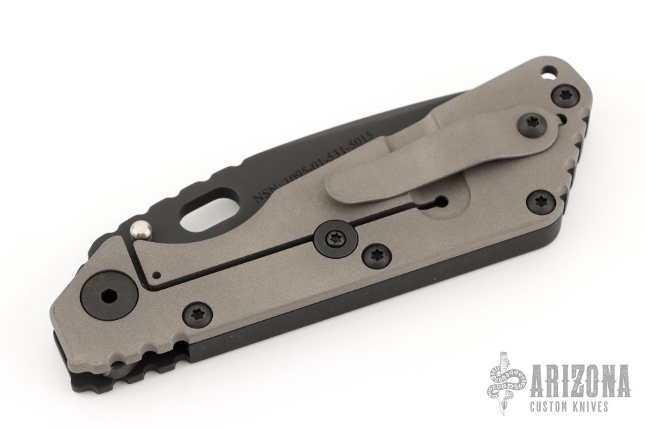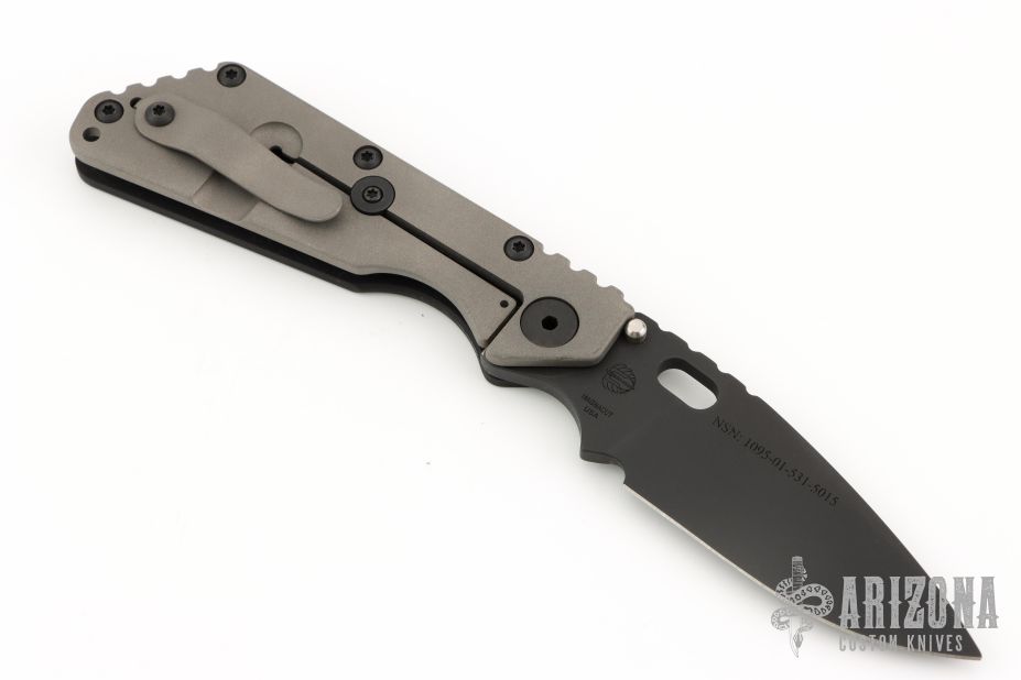 This Mick Strider SMF Fatty framelock folder features a black blade with thumbhole and notched thumbrest. The handle has a black aluminum and bead blast finished titanium frame with titanium clip, tip up carry. Jimping on blade spine. Nice lockup, detent, and blade seating. NSN: 1095-01-531-5015. Excellent condition.