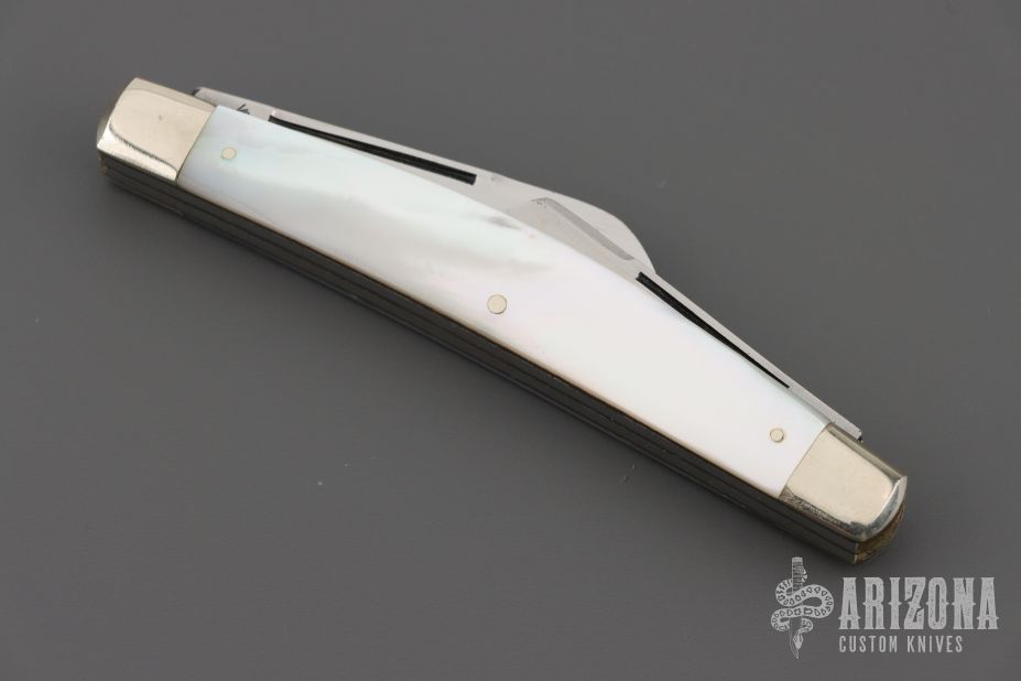 This 4-blade congress by Kissing Cranes features mirror polished blades with nail nicks. The handle has nickel silver bolsters, mother of pearl covers, brass liners and stainless steel springs. Has half-stops. Has some light scratches, otherwise excellent condition.
