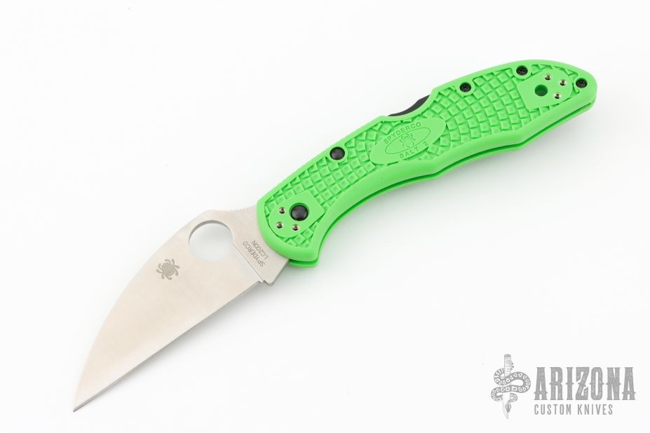Spyderco’s original Salt 2 model combined the highly refined handle ergonomics and multiple carry options of the best-selling Delica 4 platform with ultra corrosion-resistant materials. This version of the Salt 2 raises the bar even higher with the addition of LC200N martensitic blade steel and a low-friction full-flat grind. Many savvy knife users swear by Wharncliffe-style blades because their perfectly straight cutting edges offer everything from extreme cutting power to scalpel-like precision. Now that versatility is also fearlessly corrosion resistant in the form of the Salt 2 LC200N Wharncliffe. A powerful combination of advanced handle ergonomics, high-traction Bi-Directional Texturing, a stout back lock mechanism, a four-position pocket clip, a full-flat-ground LC200N blade, and a vibrant green handle color, this compact folder has it all. It is also available in both PlainEdge and fully serrated SpyderEdge formats.