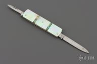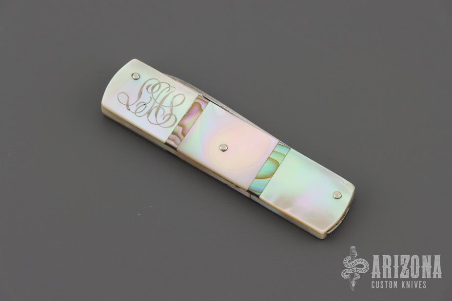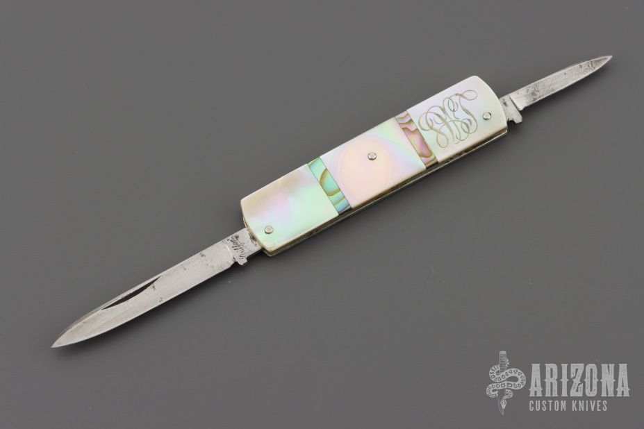 This 3-blade slipjoint by Griffon features polish finished blades with nail nicks. The handle has nickel silver liners, steel springs, mother of pearl covers, abalone spacers, with nickel silver pins. Beautiful fit and finish. Has some scuffs, a little rust, and scratches, good condition for its age and otherwise.