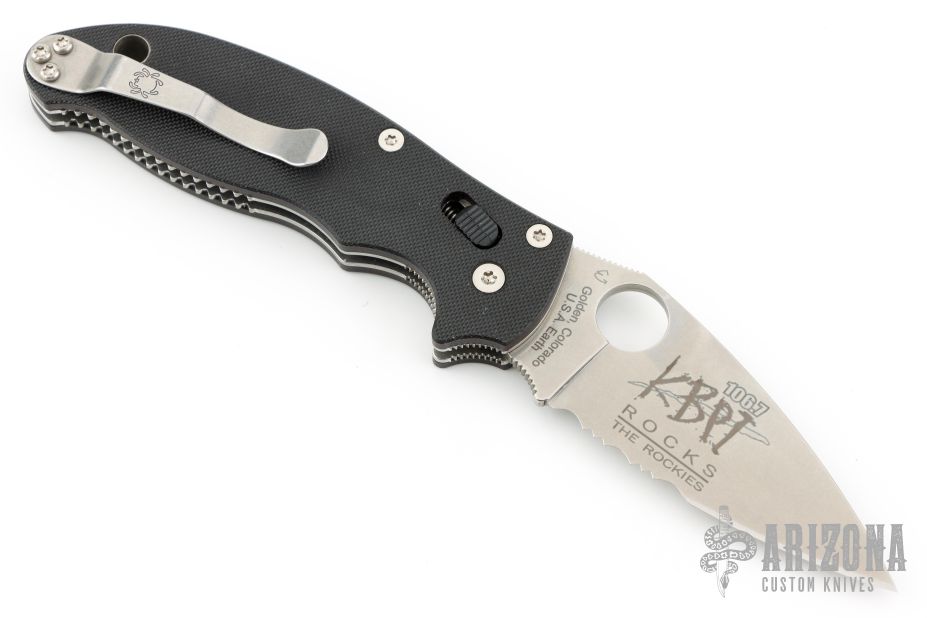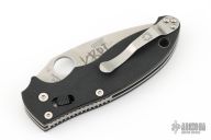 This Manix 2 Axis Lock Folder has a bead blasted blade with thumb hole and notched thumb ramp and partial serrations. Scales are black G-10 over stainless steel partially jimped liners, stainless steel tip up clip - RH/LH reversible, and stainless steel lanyard tube pin. Excellent condition. Includes original box and papers.