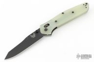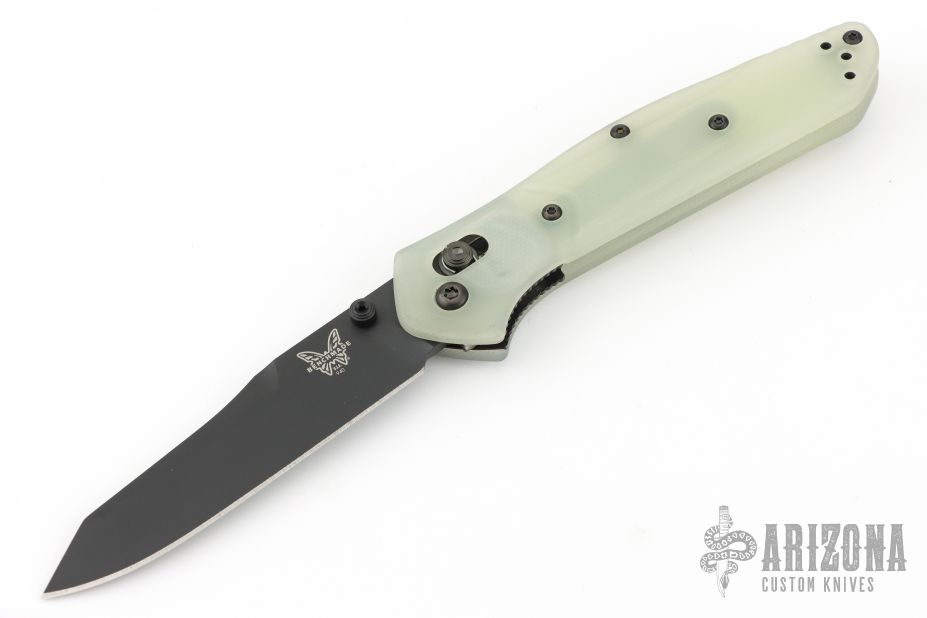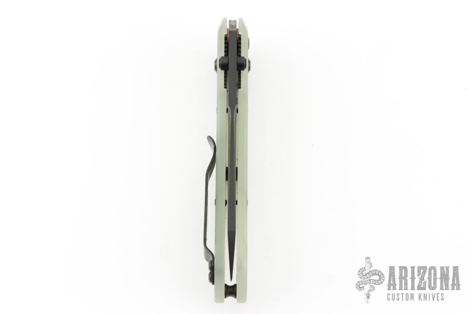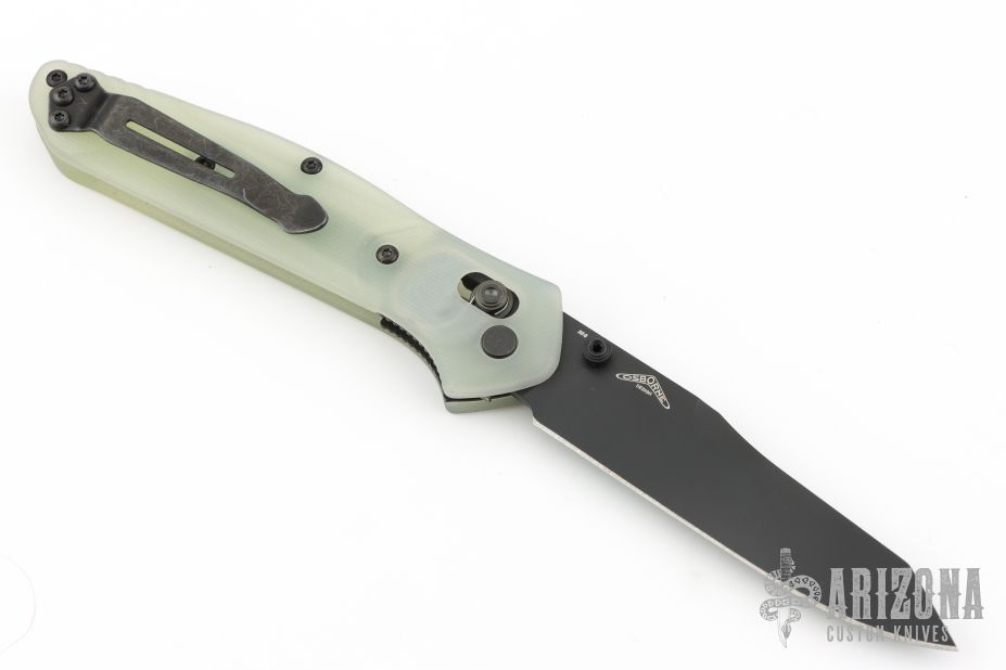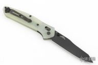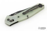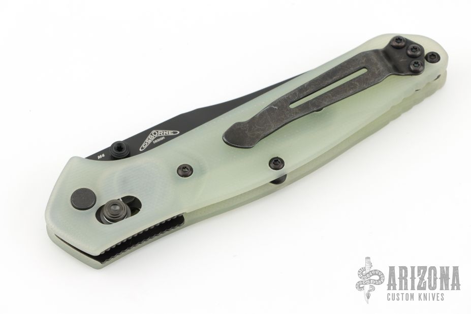 This 940BK Osborne Axis Lock Folder from Benchmade has a black coated clip point blade with false top edge and dual thumbstuds. Handle is jade G10 with a black finished stainless steel tip up clip (RH/LH Reversible). Nice blade seating and lockup. Comes with original box, papers, and drawstring pouch. Excellent condition.