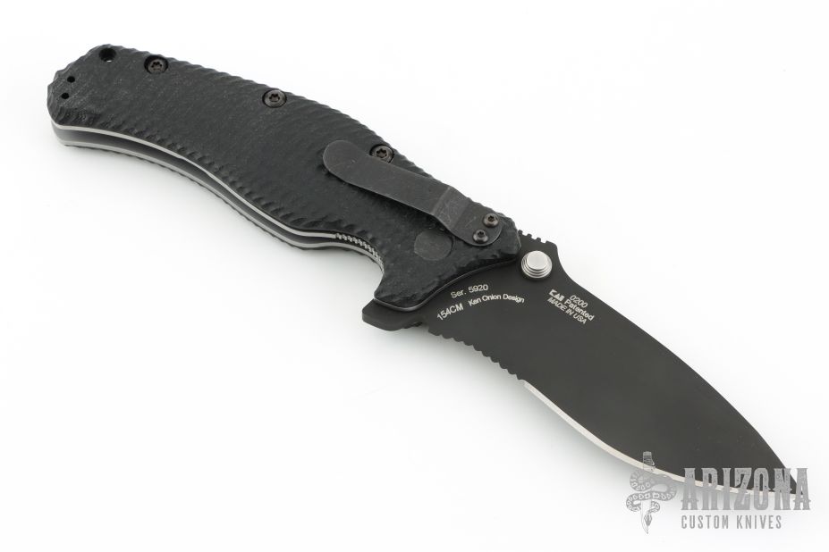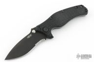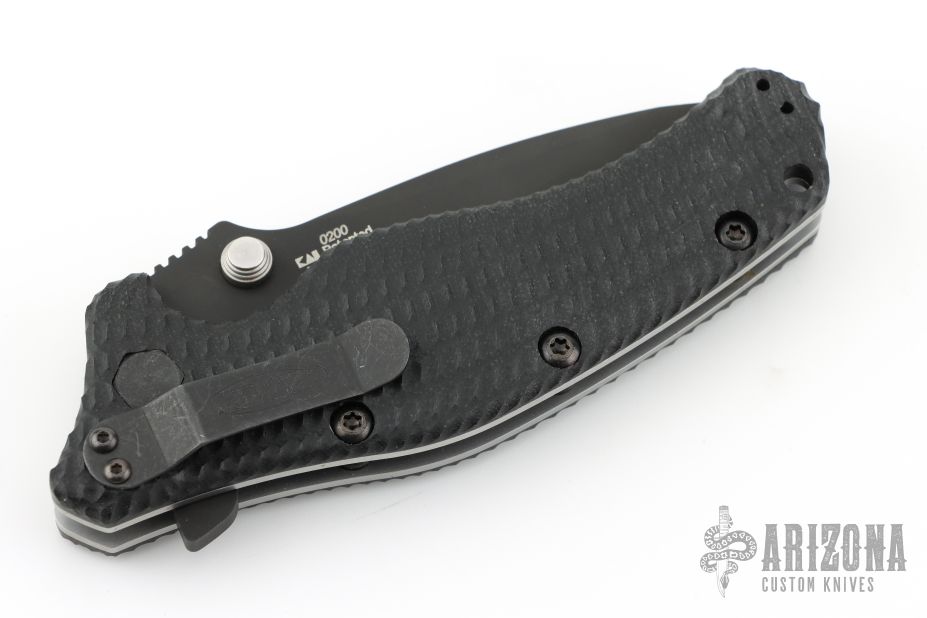 The Zero Tolerance 0200 Folder Knife features a black tactical blade with a partially serrated edge. The 0200 features a recurve blade. The blade is made from 154CM stainless steel and has a black Tungsten DLC coating. The scales are 3D machined from G10 to give you maximum grip. It also has ambidextrous thumb studs for one hand opening. The 0200 also includes multi position (tip up or down, right or left) removable pocket clip. Smooth flipping action with no wrist action required. Comes with original box and papers. Excellent condition. #5920