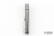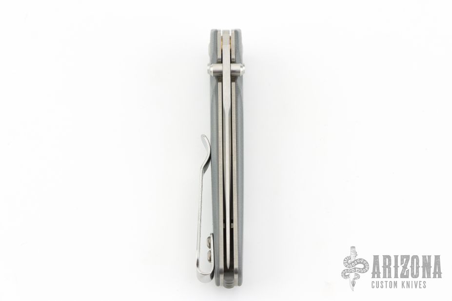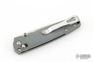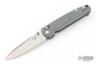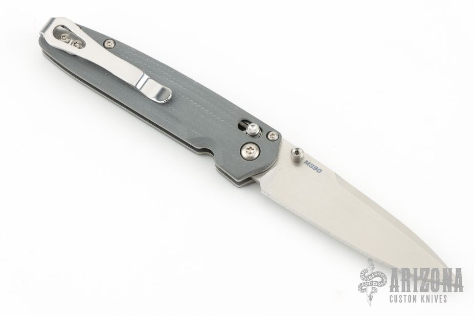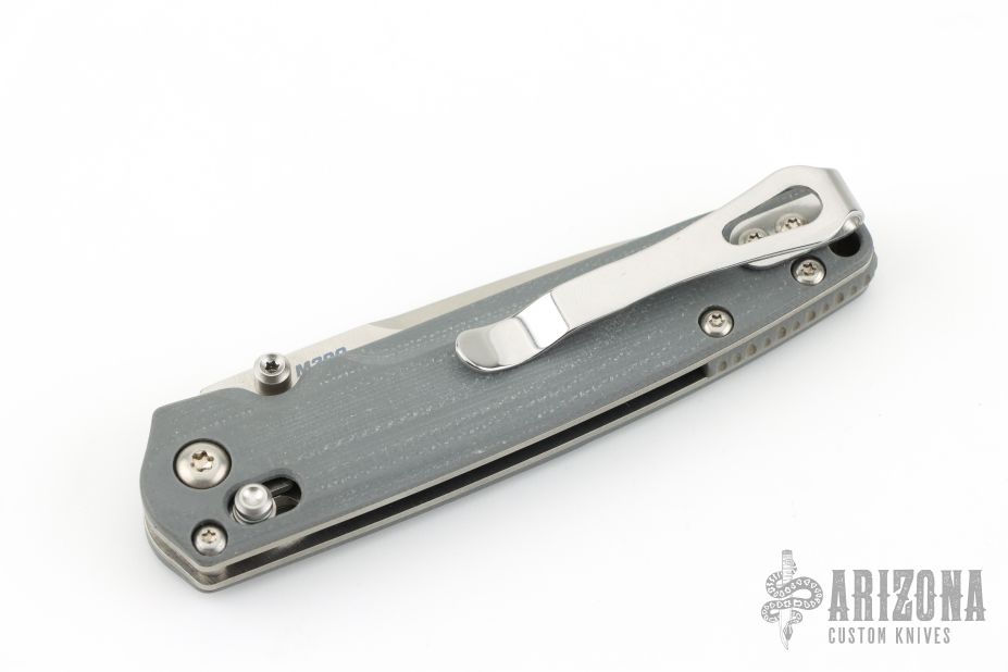 This 485 Valet by Benchmade features a tumble finished drop point blade with swedge and dual thumb studs. The handle is comprised of gray G10 over steel liners. Lanyard hole in pommel and the deep carry clip is reversible for left or right hand tip up carry. Comes with original box, pouch and papers. Excellent condition.