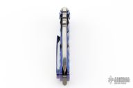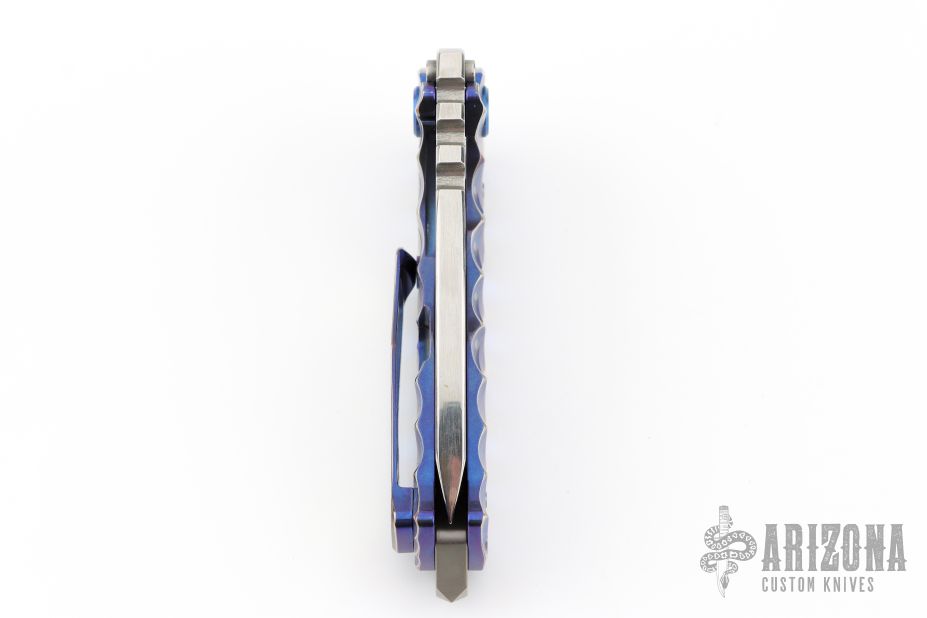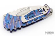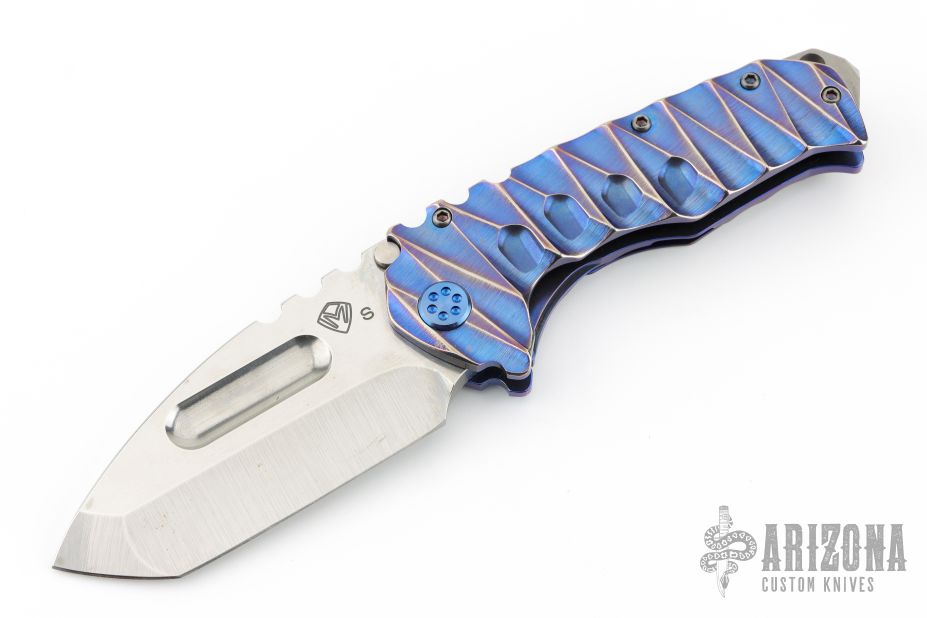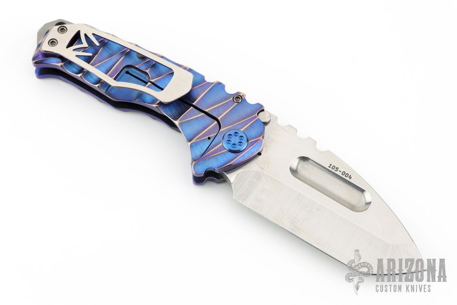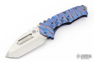 This Praetorian Ti by Medford Knife and Tool features a tumble finished tanto blade with fullers and notched thumbrest. The handle is comprised of an anodized and Lightning sculpted titanium frame over a steel backspacer/glass breaker. The satin titanium pocket clip is positioned for right hand, tip up carry. Includes original box, hard case and COA dated November 3, 2021. Has a couple light scratches on the clip, otherwise excellent condition.