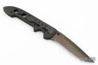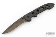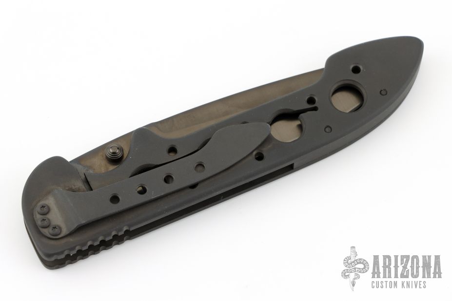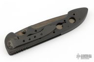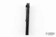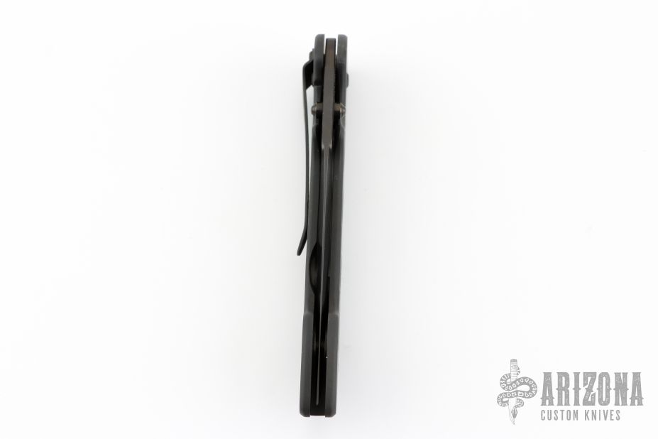 This Perfigo by Crawford Knives features a DLC satin finished blade with swedge and dual thumbstuds. The handle has a bead blasted and DLC finished titanium frame, DLC titanium tip down clip and a stainless steel backspacer. Nice detent, blade seating and lockup. Has a couple very light scuffs, otherwise excellent condition.