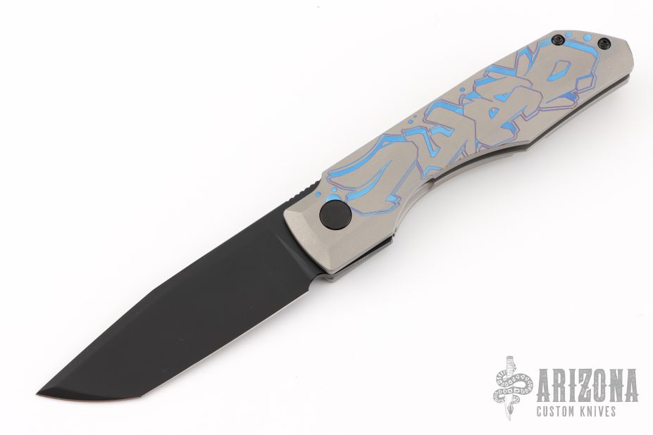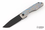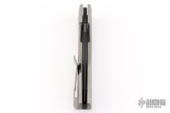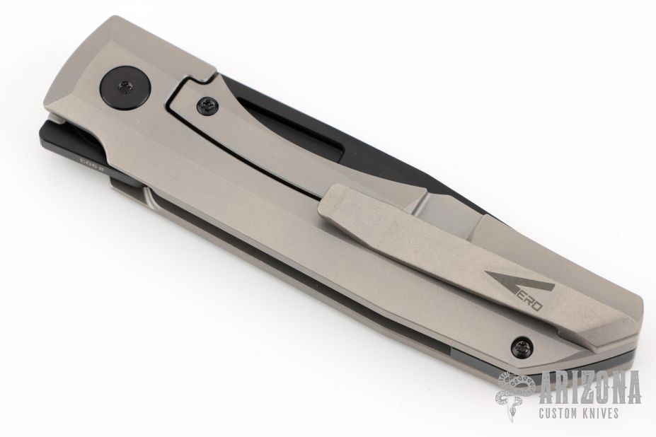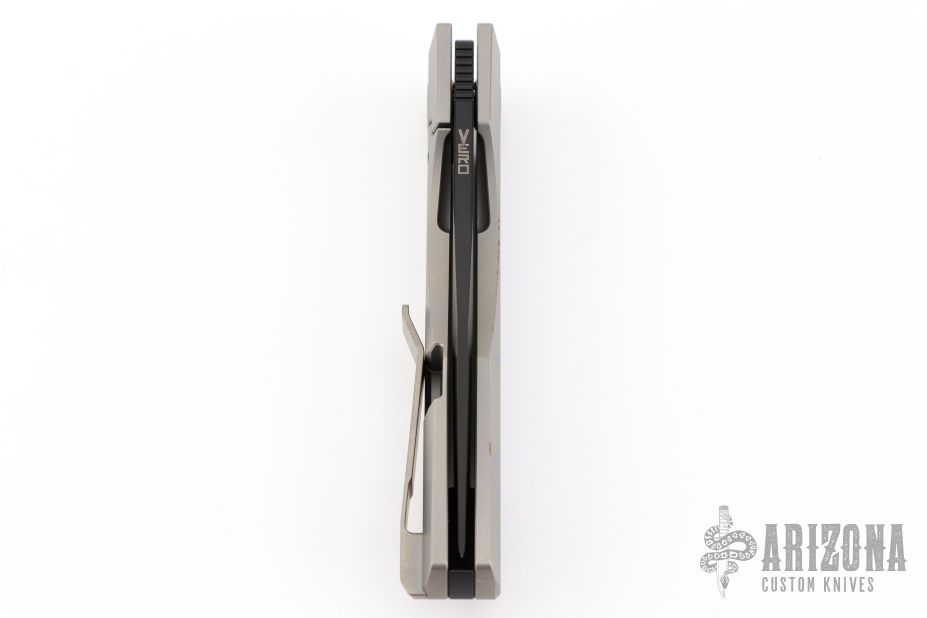 This Impulse by Vero Engineering features a black DLC blade with notched thumbrest and flipper. The handle has a laser engraved and stonewashed titanium frame with black titanium hardware, tip up titanium clip with hidden screws and DLC titanium backspacer. Nice detent, lockup and blade seating. Comes with a zippered case. #903. Excellent condition.