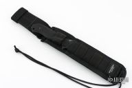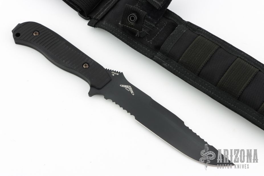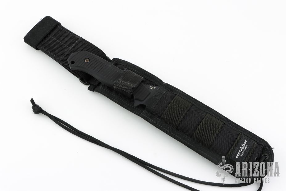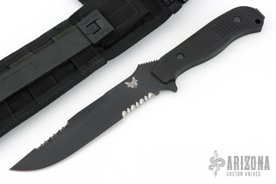 This Benchmade Fixed Presidio has a black blade with partially serrated edge and notched thumbrest, .181" blade stock and 1.439" blade depth, full tang construction with black aluminum scales and lanyard hole. Osborne design. Comes with original box, papers, and nylon belt sheath. Has a couple light scuffs, excellent condition otherwise.