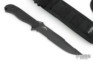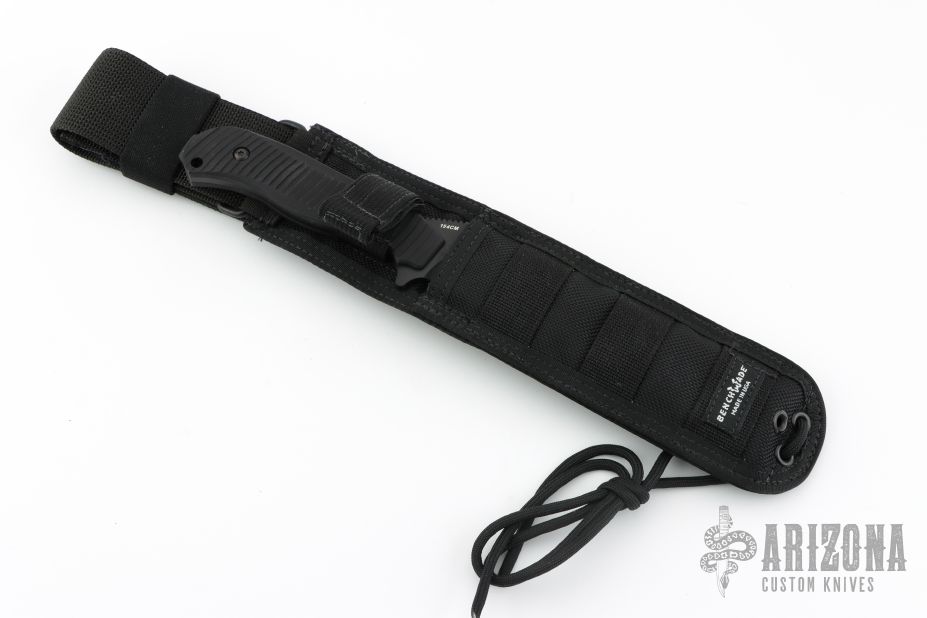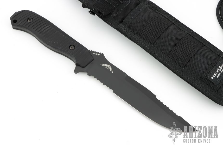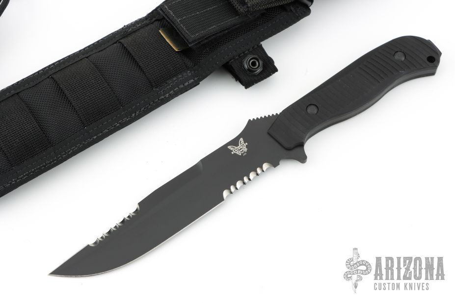 This Benchmade Fixed Presidio has a black blade with partially serrated edge and notched thumbrest, .181" blade stock and 1.439" blade depth, full tang construction with black aluminum scales and lanyard hole. Osborne design. Comes with original box, papers, and nylon belt sheath. Has a couple light scuffs, excellent condition otherwise.
