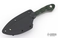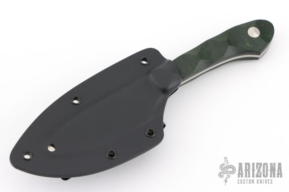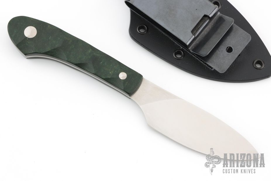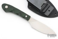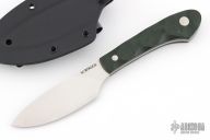 This Model 8 by James Scroggs features a high satin finished drop point blade, AEB-L stainless steel, .106" blade stock and .991" blade depth, full tang construction. The handle has green warwood scales with stainless steel pins. Comes with a kydex sheath with removable belt clip. Has a couple light scratches, excellent condition otherwise.