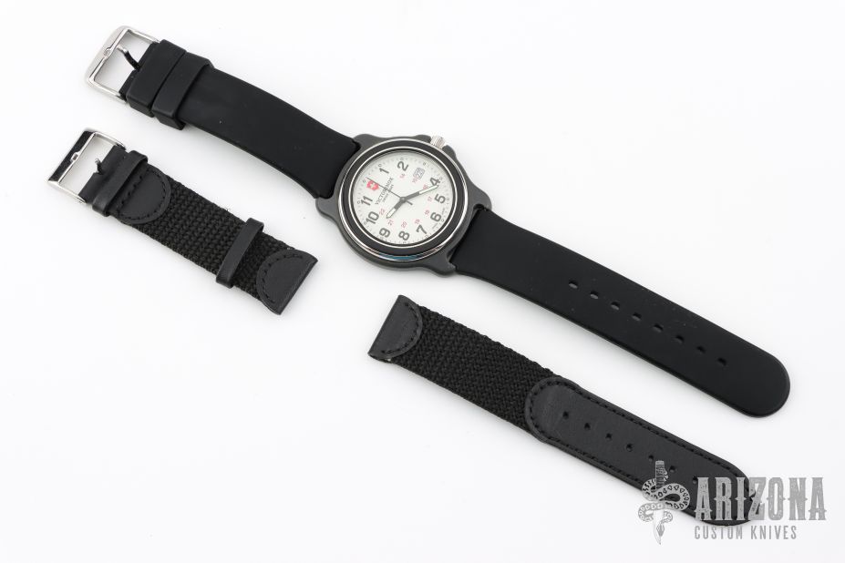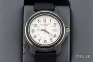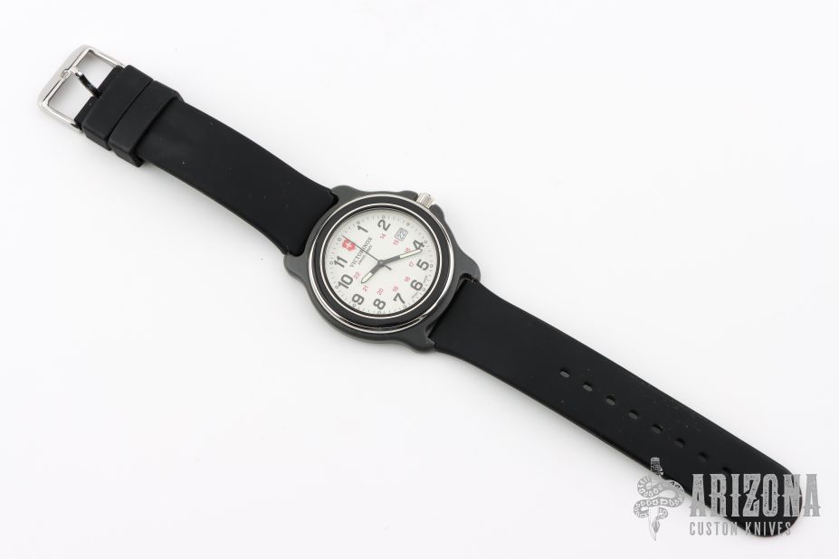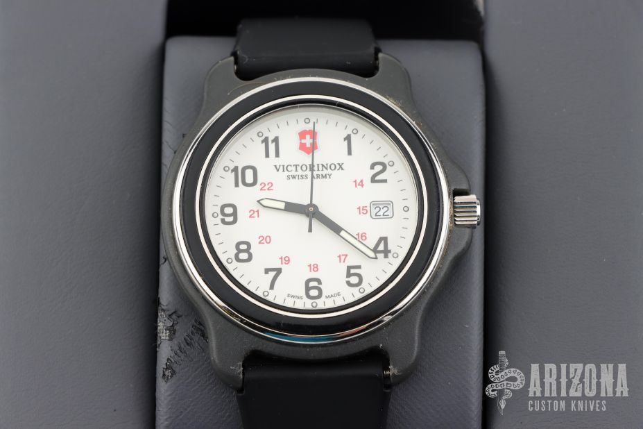 Victorinox Swiss Army Officer's 43mm watch with white dial and black bezel. Comes with original box, manual and nylon strap. Currently wearing a rubber band. Has a couple light scratches, otherwise excellent condition.