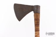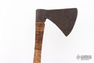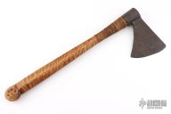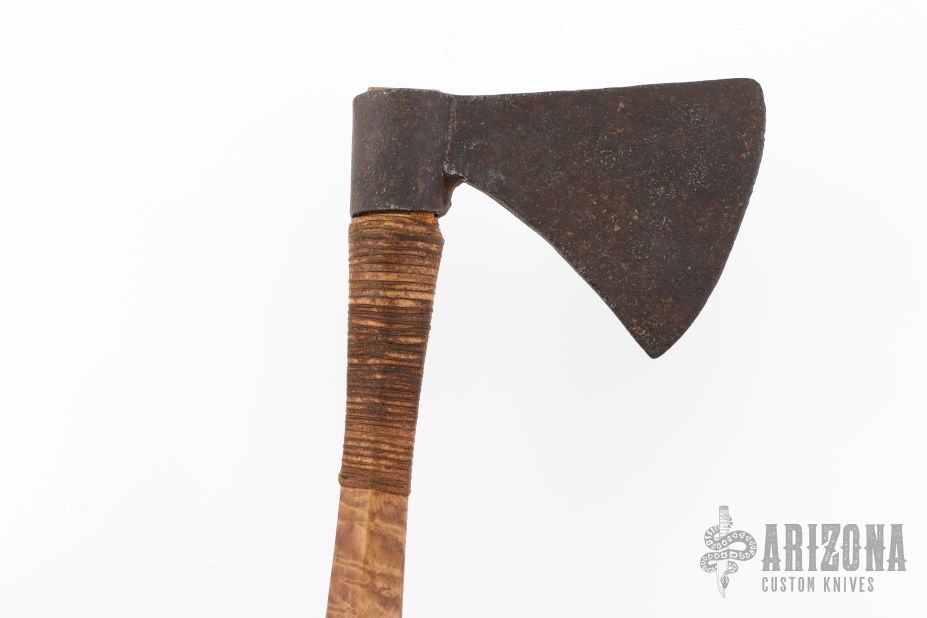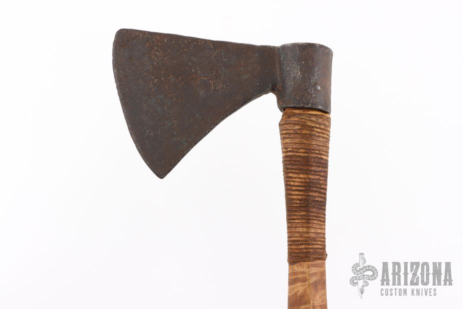 This is an Antique Pre-American Revolution (pre-1776) Spanish Trade Axe head with a custom curly maple handle with leather wrap and decorative brass studs at the butt. The original makers mark is visible and is what looks like a palm tree. The axe head itself is old and has pitting and oxidation, but is still in good condition. The handle was made by Ryan Johnson of RMJ Tactical. It is hexagonal shaped with a swell towards the butt. The handle was made from the wood of an antique coat rack. Comes with original sales receipt from an antique store.