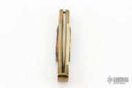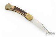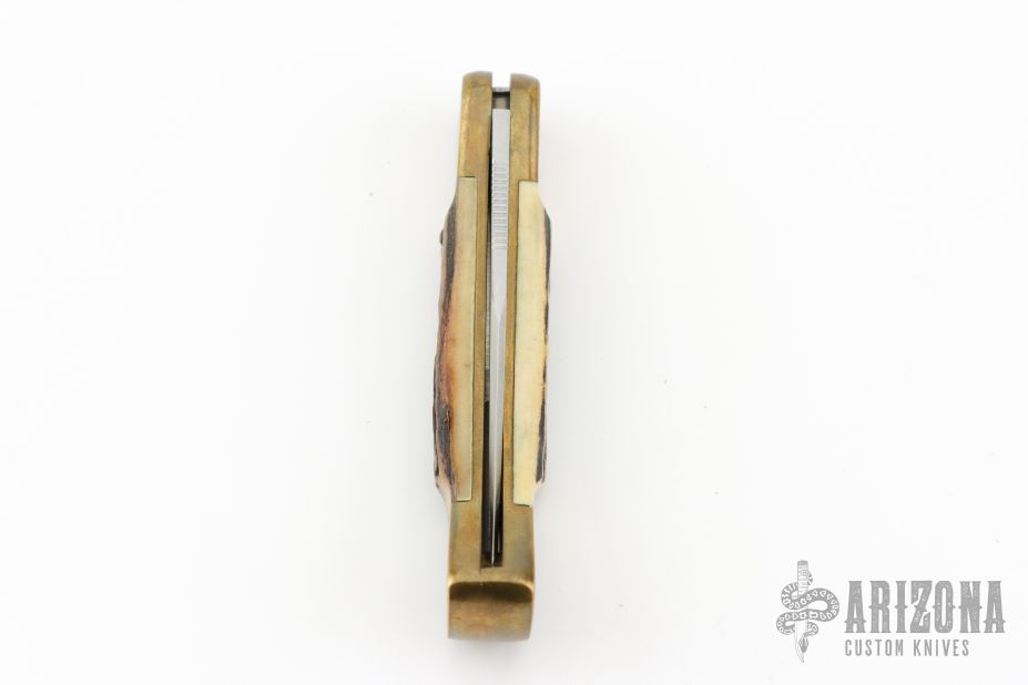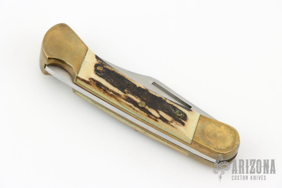 This Vintage German-made lockback by Puma has brass bolsters with integral liners. Very nice stag scales. Blade is satin finished with nail nick and notched thumbrest. Comes with a custom leather belt sheath with antiqued steel concho. Has a couple light scratches, otherwise excellent condition. #51592