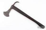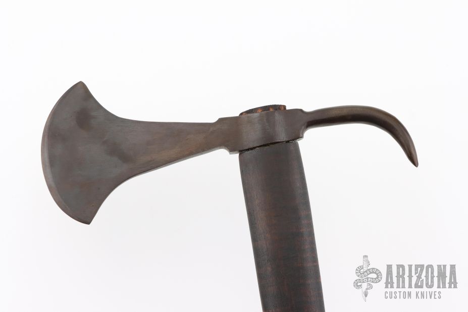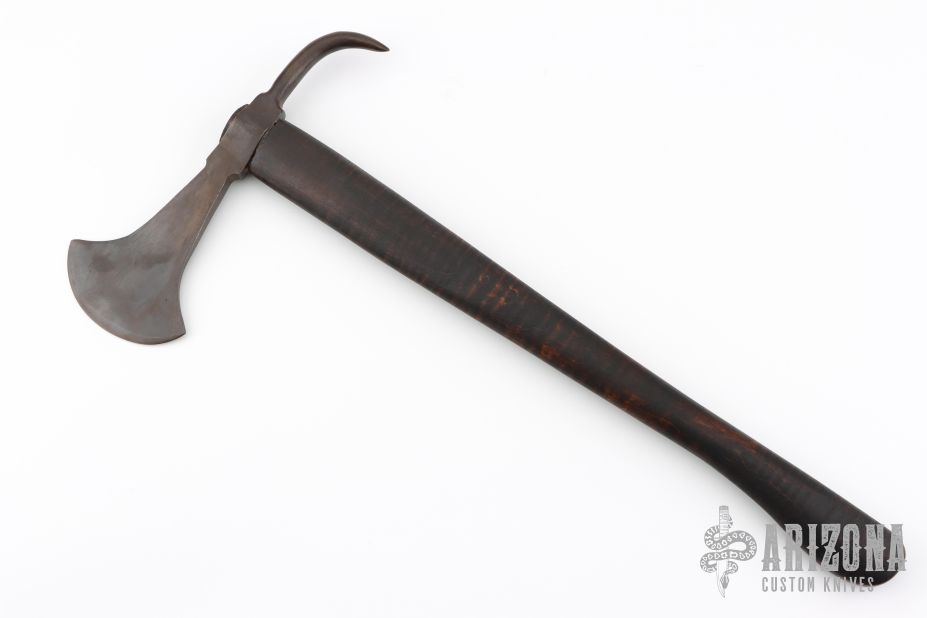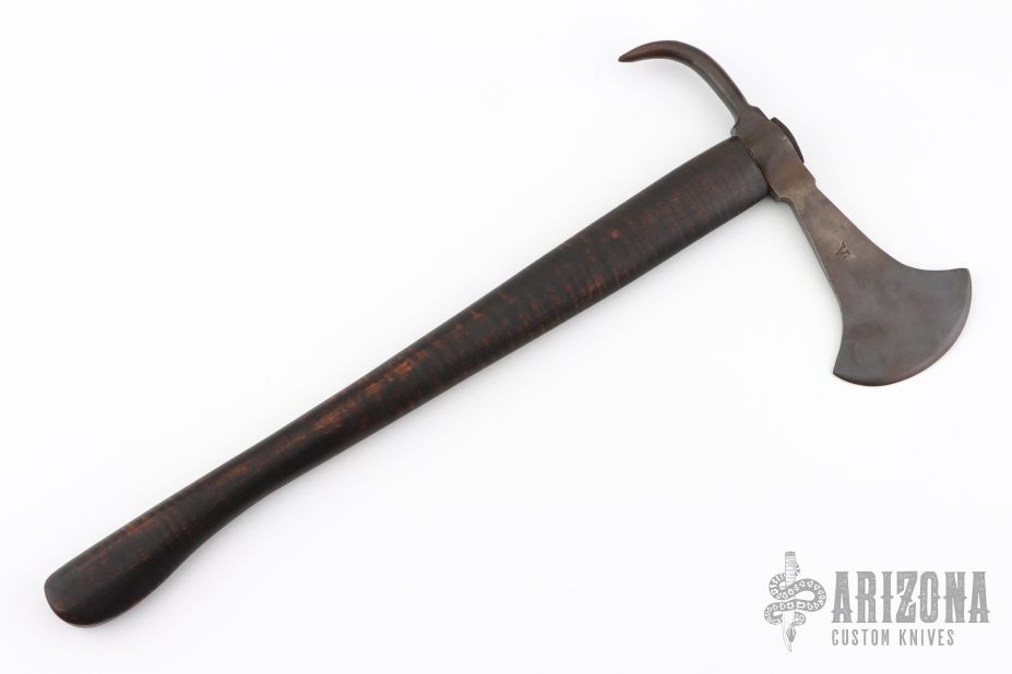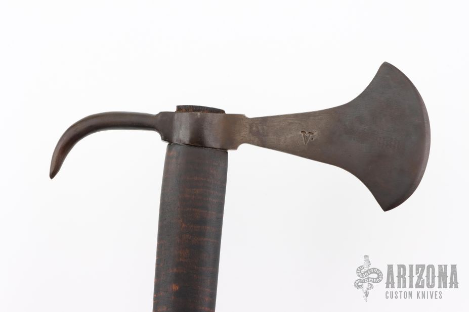 This Trade Axe Style Tomahawk by Jack Vargo features a blackened blade with a curved spike at the butt, 3.25" blade length and 8.125" from the blade edge to the tip of the spike. The haft is curly maple with a dark stain. Excellent condition.