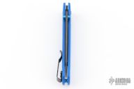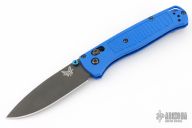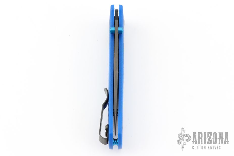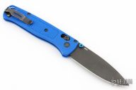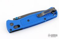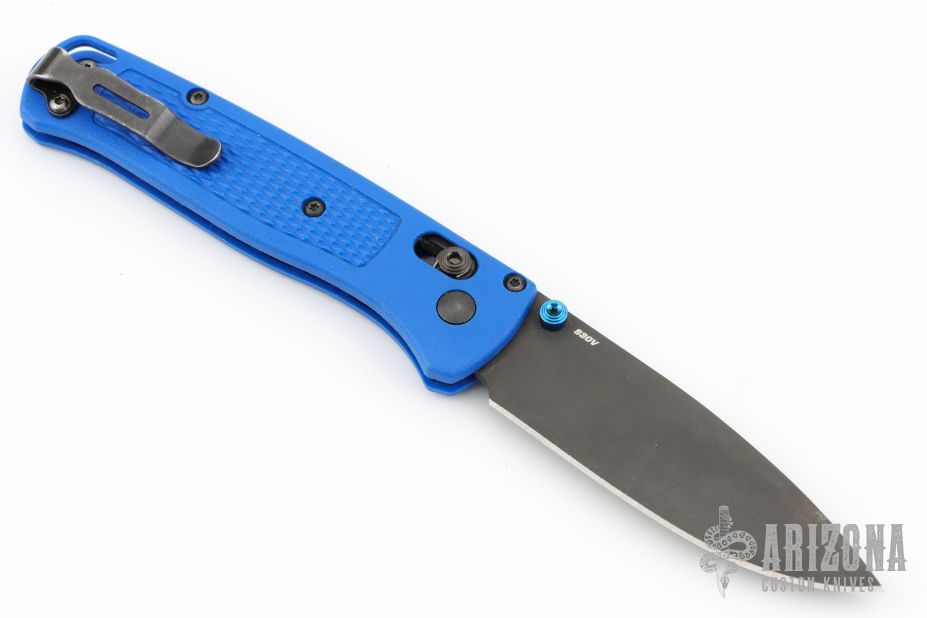The Benchmade Custom Bugout features a drop point blade with a black finish. It's a manual opener with ambidextrous thumb studs. This AXIS lock has blue handles with black hardware, a mini deep-carry pocket clip, and a lanyard hole. Excellent condition.