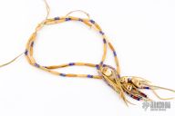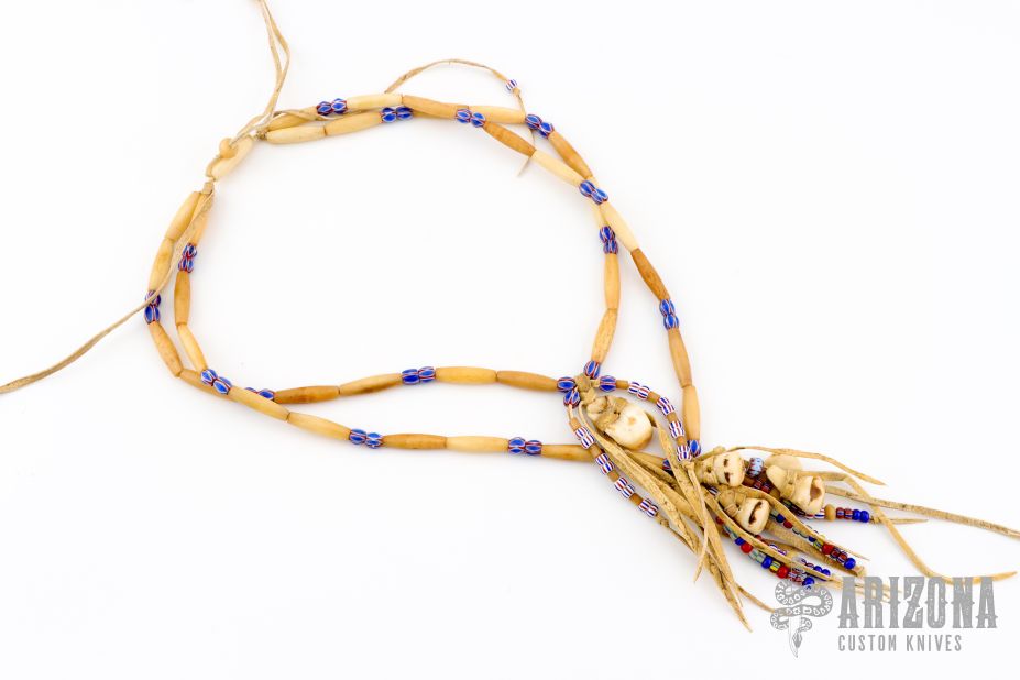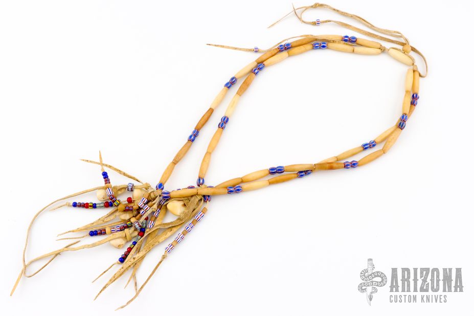 This necklace by C.O. Pawling is made with Brain-tanned leather, bone hair pipe, trade beads, and five elk teeth. A one of a kind necklace with 20" drape. Comes with COA. New from maker.