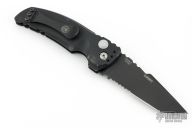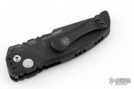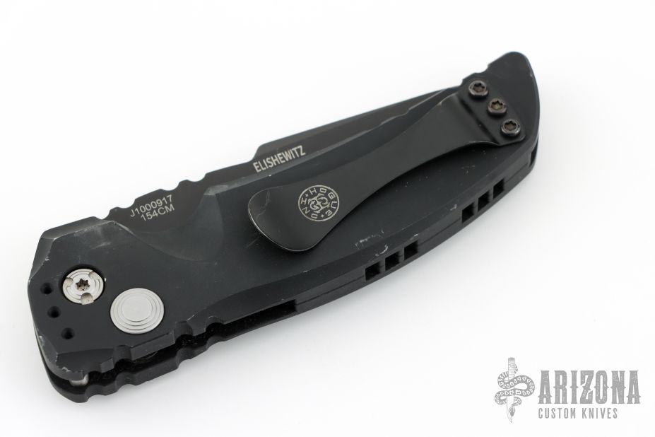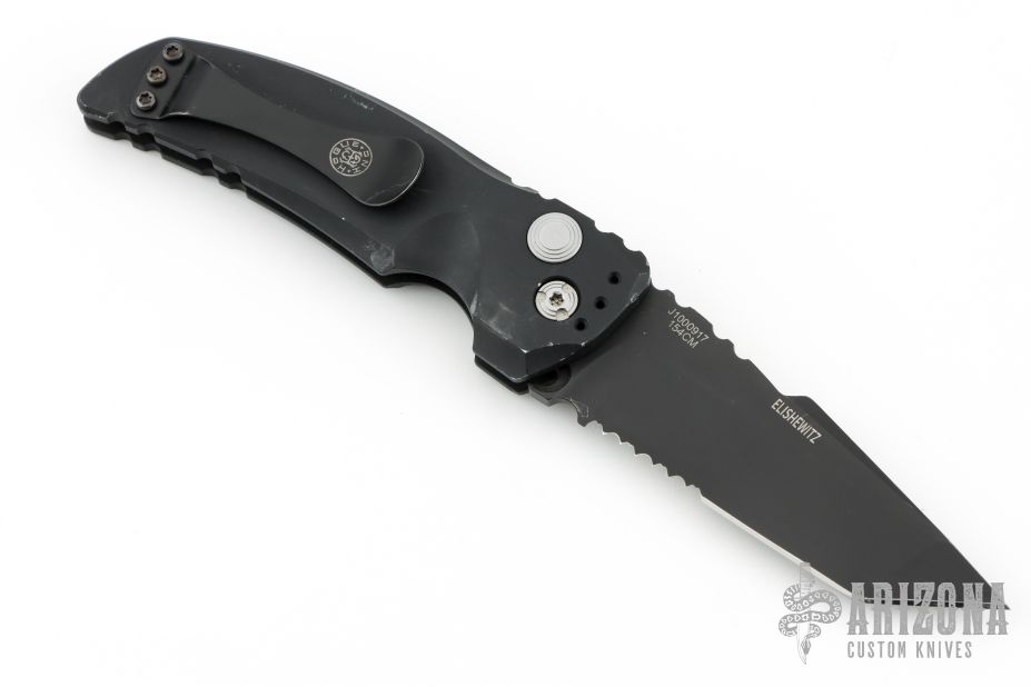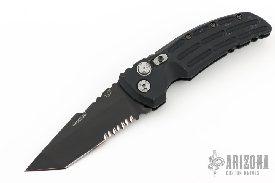 This EX-A01 by Hogue Knives is an Allen Elishewitz design, it features a black tanto partially serrated 154CM blade with notched thumbrest. The handle is black aluminum, tip up or down reversible black stainless steel clip. Has safety. Has scuffs/scratches otherwise the knife is in good condition.  This knife would make a great user.