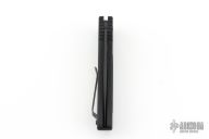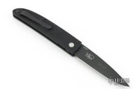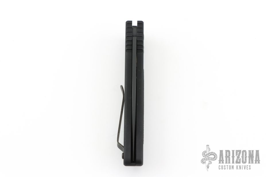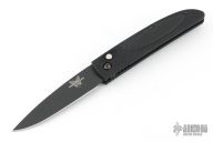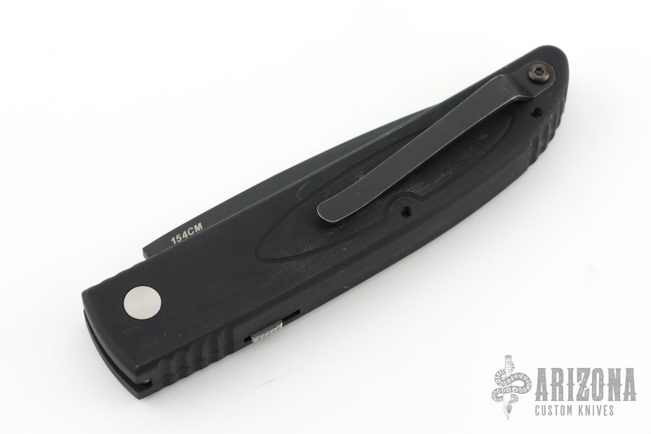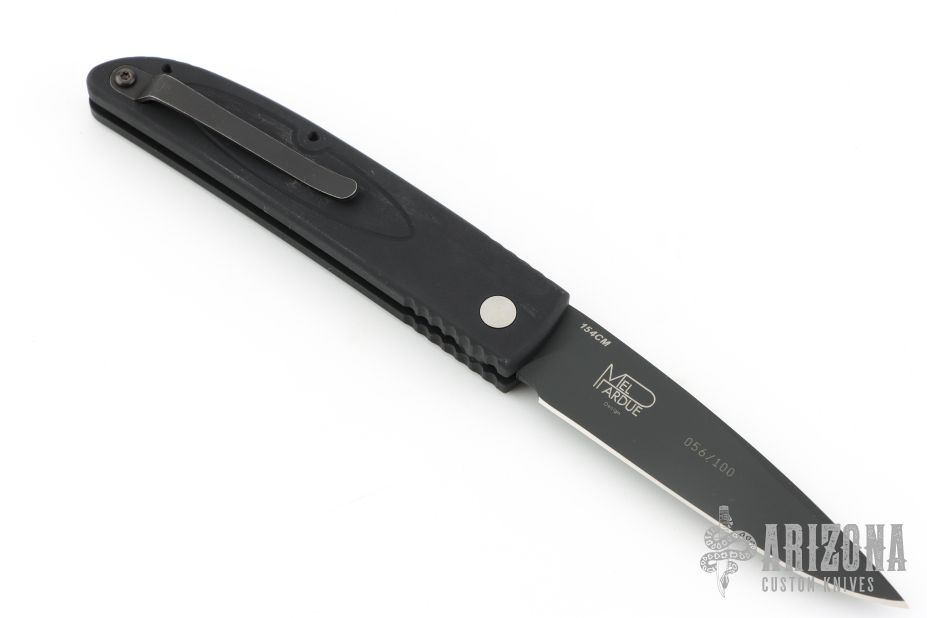 This Mel Pardue 3200 Auto LE 056/100 has a black drop point blade. Handle is black anodized aluminum with A-side G10 overlay, safety on handle spine, and black stainless steel tip up clip. Great action and lockup. Excellent condition. Comes with original box and papers. Discontinued.