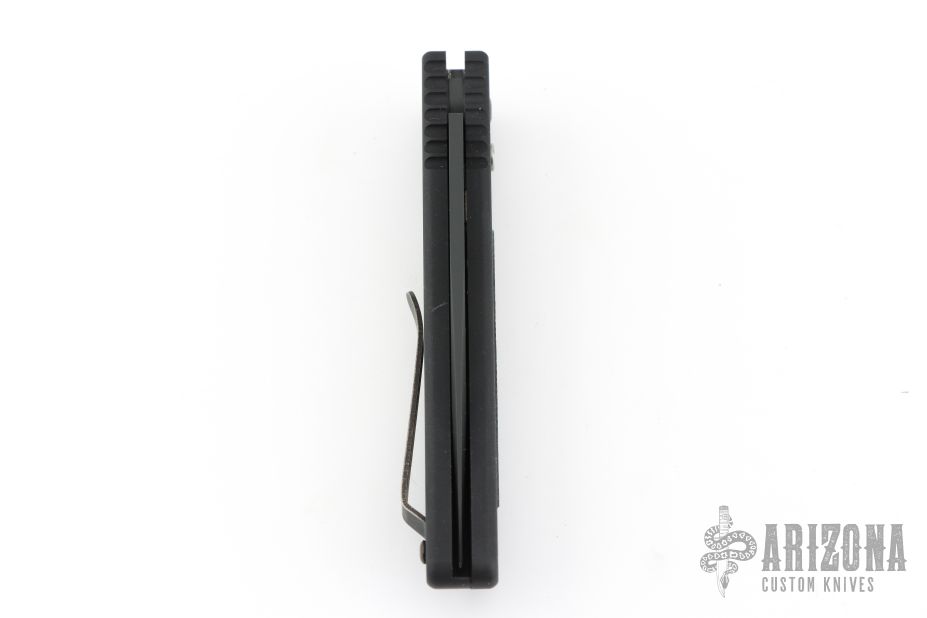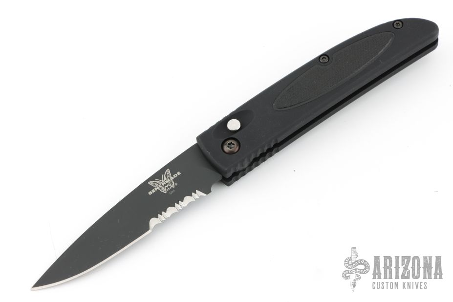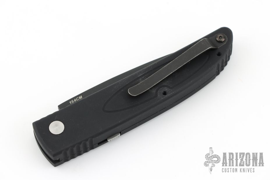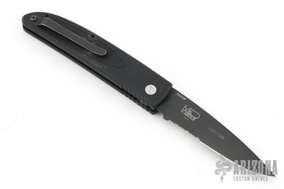 This Mel Pardue 3200 Auto LE 056/100 has a black drop point partially serrated blade. Handle is black anodized aluminum with A-side G10 overlay, safety on handle spine, and black stainless steel tip up clip. Great action and lockup. Excellent condition. Comes with original box and papers. Discontinued.