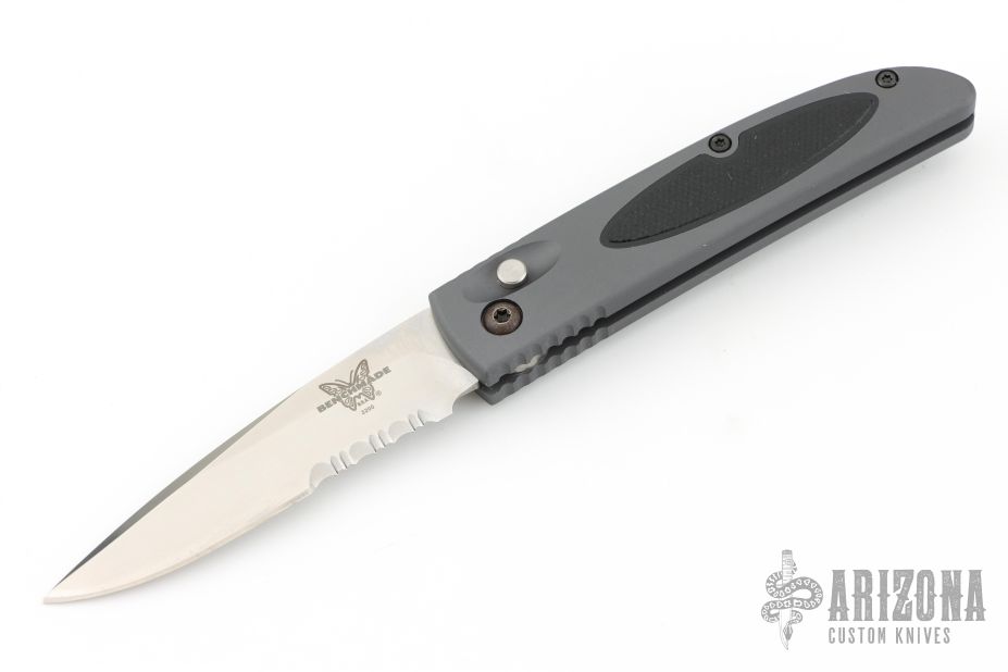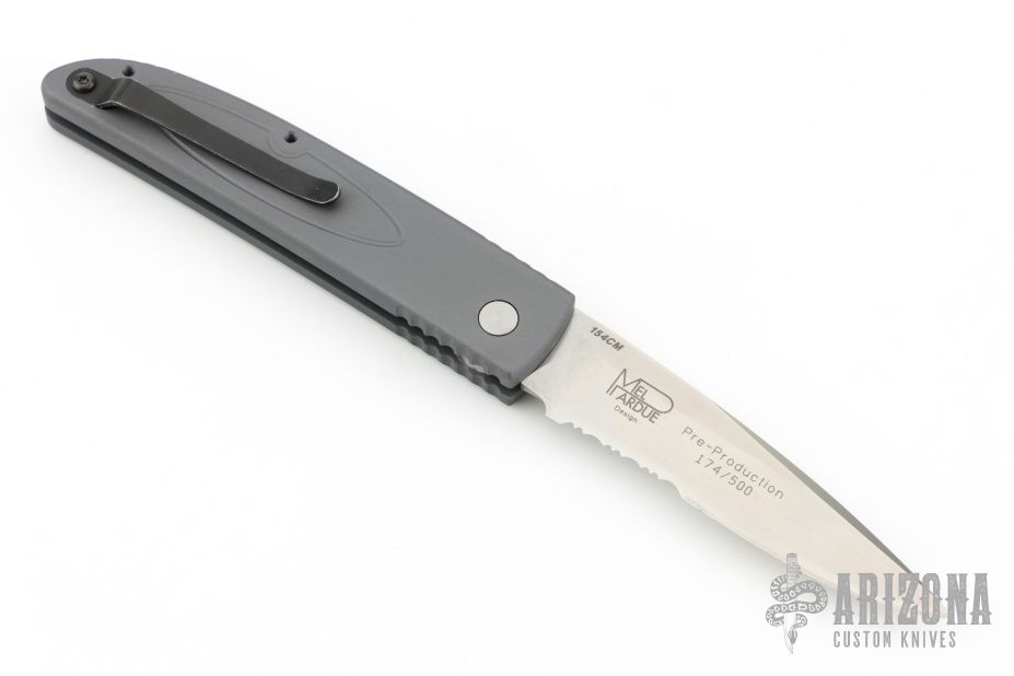 The 3200S automatic is a Mel Pardue design. Side opening, coil spring automatic. Tumble finish partially serrated blade. Black coated stainless steel clip. Sliding safety. Blade marked "Pre-Production 174/500 ". Comes with original box and papers. Excellent condition.