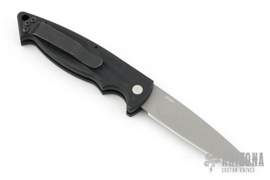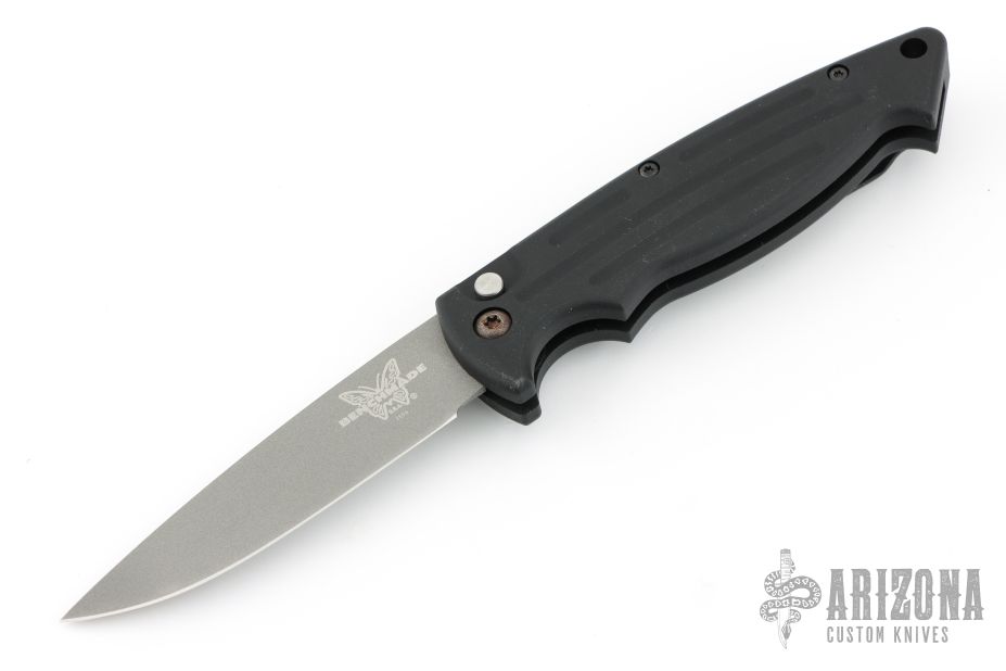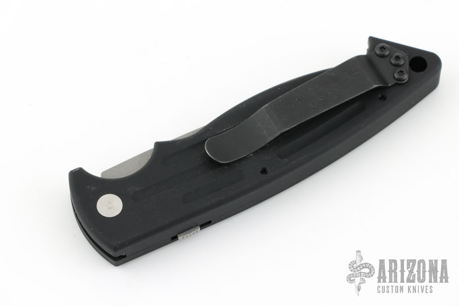 This Mini Reflex by Benchmade features a bead blasted drop point blade and a black aluminum handle with black stainless steel tip up clip, lanyard hole at the butt and safety on the spine. Comes with original box and papers. Excellent condition.