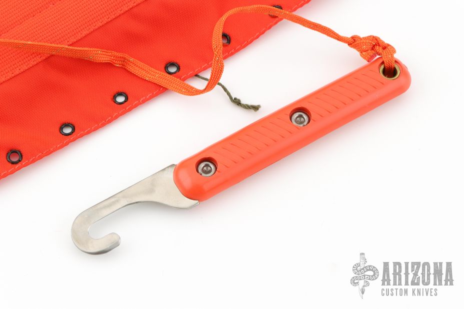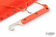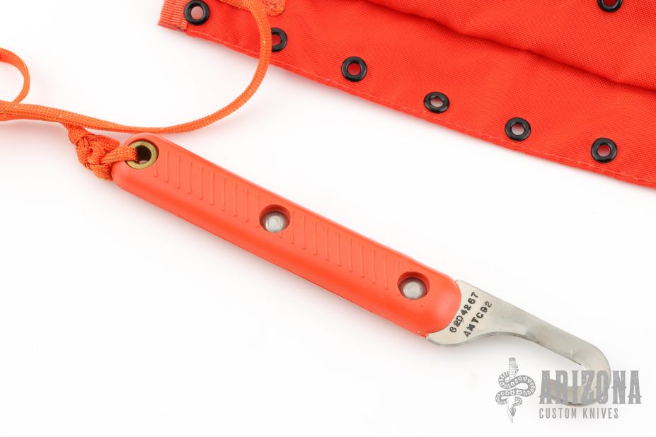 This US Military Shroud Cutter comes with its original orange pouch. I unstitched the pouch to get it out, but the original string is there. Has a cord cutter hook with orange scales. Excellent condition.