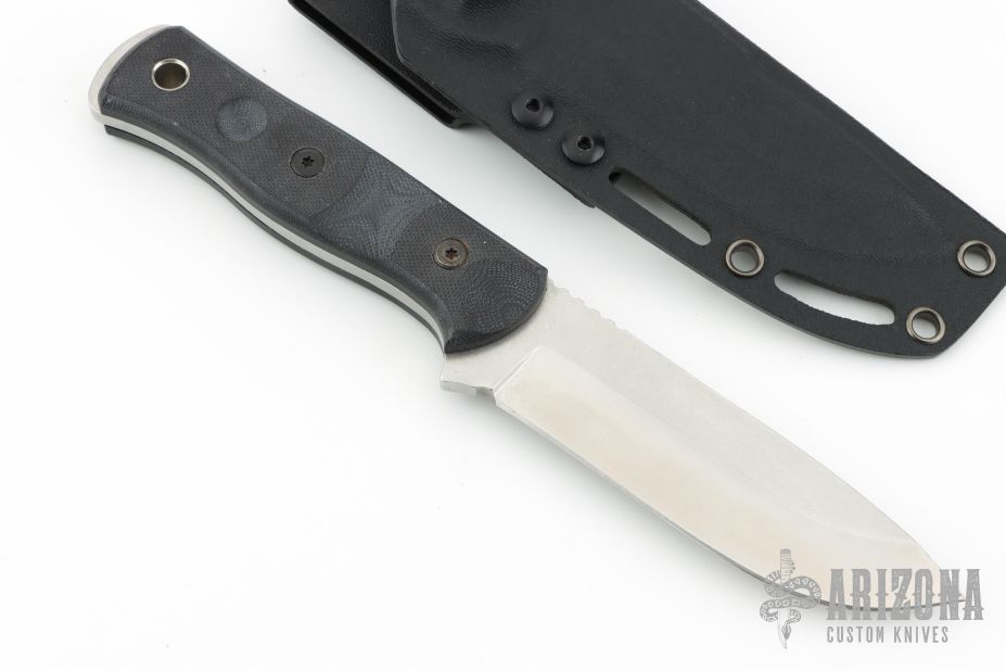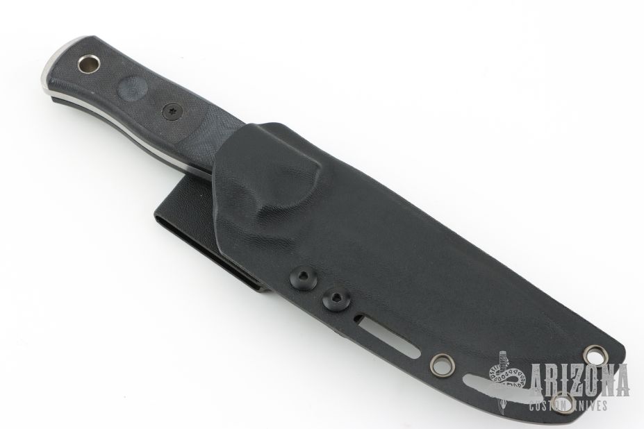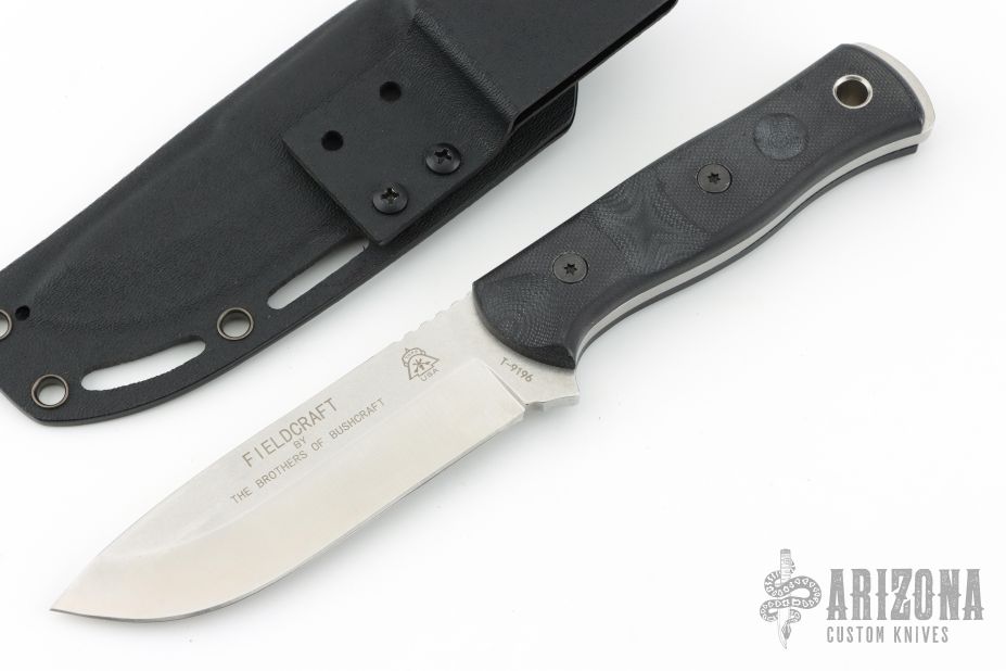 This Fieldcraft Fixed Blade was designed by Brothers of Bushcraft for TOPS knives. It features a two-tone blade with satin grinds with a notched thumbrest. The handle is comprised of black G10 over full tang construction. The handle features a bow drill divot on both scales and the exposed tang pommel features a divot ground into the tang to allow the scraping of a fire steel without having to leave the blade edge exposed. Comes with a Kydex sheath with belt clip. Has a couple light scratches, otherwise great condition.