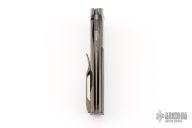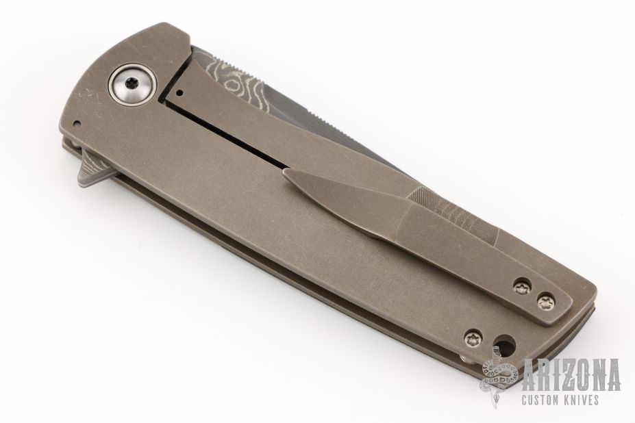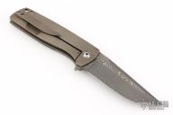 This Myrmidon by Tim Curry features a Armor Core San Mai Damascus clip point blade with swedge, flipper and notched thumbrest. The handle has an anodized and tumble finished titanium frame, Armor Core San Mai Damascus bolster, linear carbon fiber scale, titanium pivot collars, lanyard hole in pommel, titanium tip up clip. Includes a Velcro case. Has a few light scratches on the blade, otherwise excellent condition. Comes with COA dated September 2016.