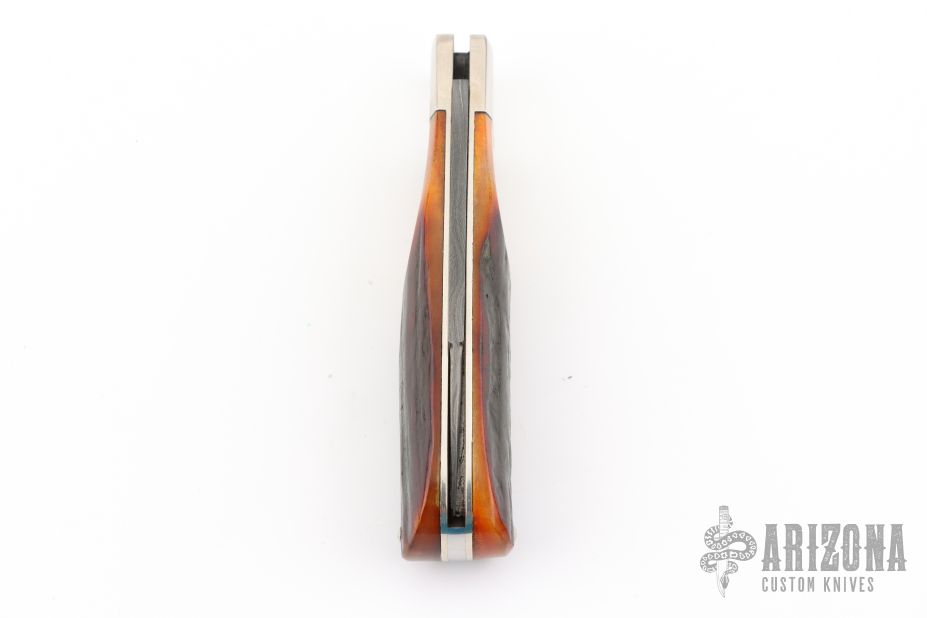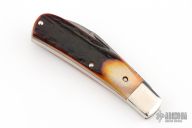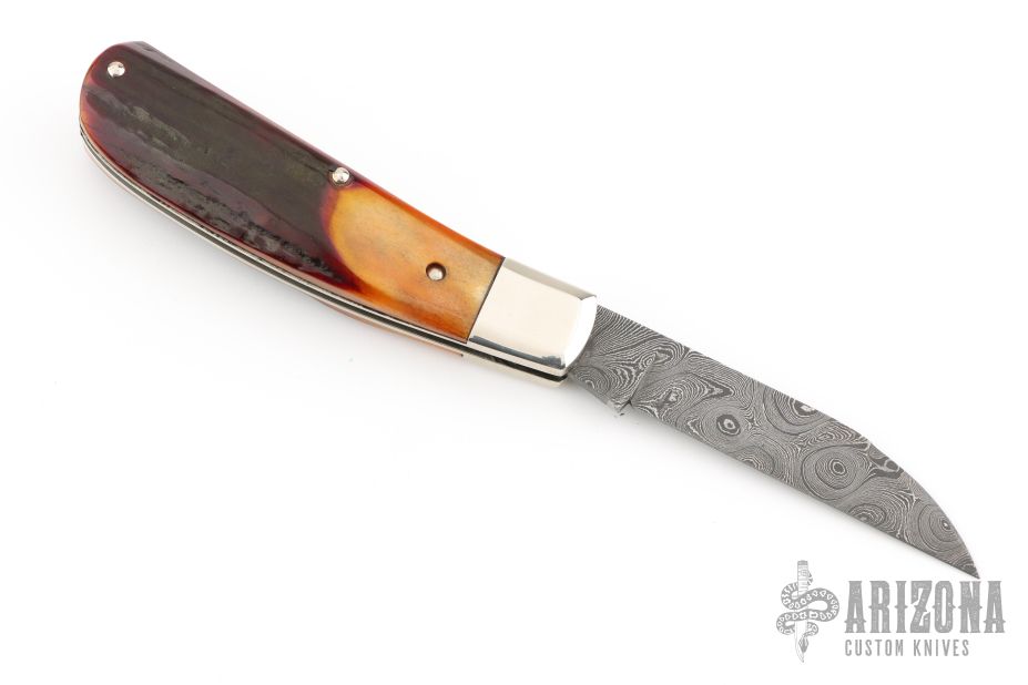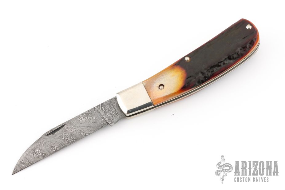 This Phoenix Jack Slipjoint from Tuna Valley Cutlery Company features a Raindrop Damascus blade with swedge and nail nick. The handle nickel silver bolsters, stag covers, nickel silver liners and a 154CM stainless steel spring. Half-stop. Excellent condition. Comes with original tube and COA dated August 14, 2020.