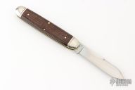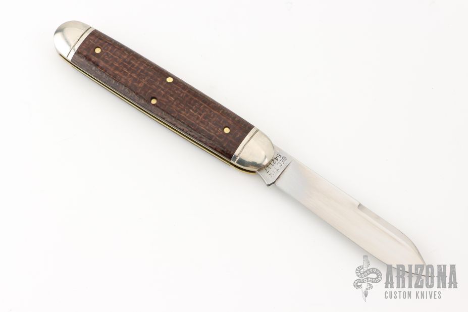 This Big Jack by Great Eastern Cutlery features a polished blade with long pull nail nick and false top edge. The handle has fluted nickel silver bolsters and butt, brown burlap micarta scales with nickel silver leaf escutcheon, brass liners, and a stainless steel backspacer. Comes with original tube and wax paper. Excellent condition.