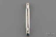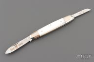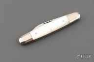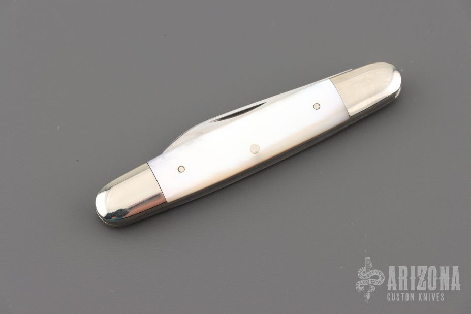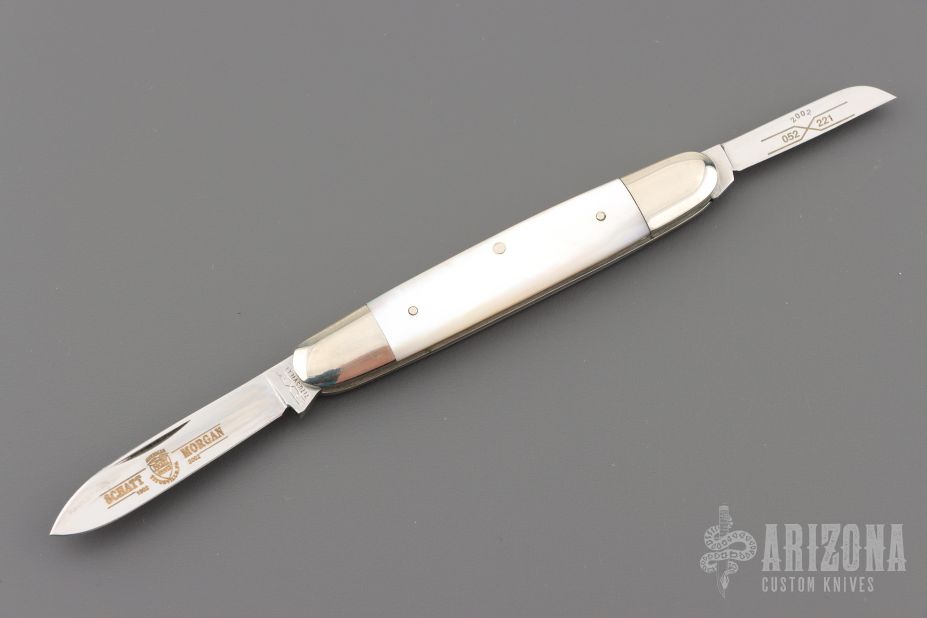 This knife by Schatt & Morgan features mirror finished blades with nail nicks. The handle has nickel silver bolsters, mother of pearl covers, nickel silver liners and stainless steel spring. Comes with original box. Excellent condition.