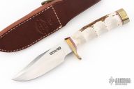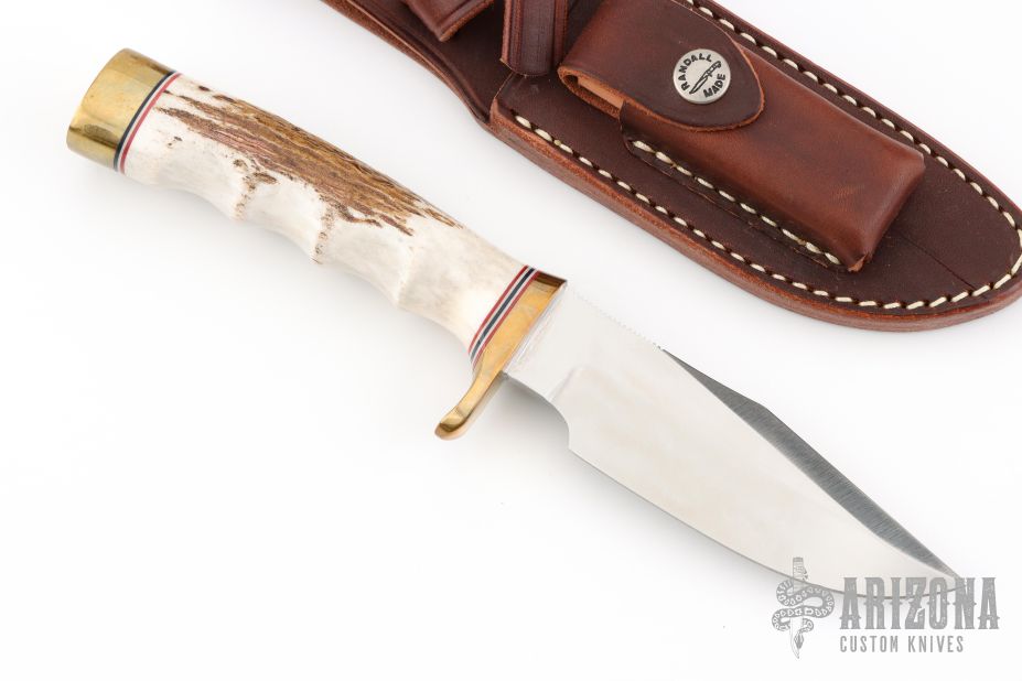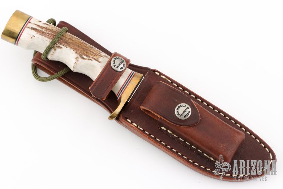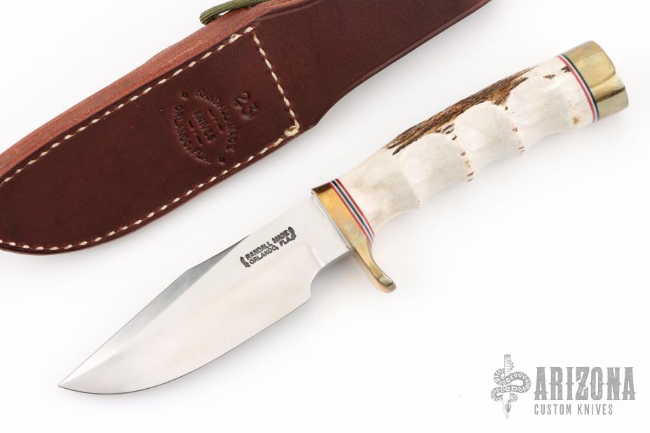 This Model 23 "Gamemaster" by Randall Made Knives features a satin finished clip point blade with sharpened top edge and notched thumbrest, .225" blade stock and 1.335" blade depth hidden tang construction. The handle has a brass guard and butt cap, finger groove stag grip with red/white/blue spacers. Comes with a brown leather sheath and original paper wrapping. Excellent condition.