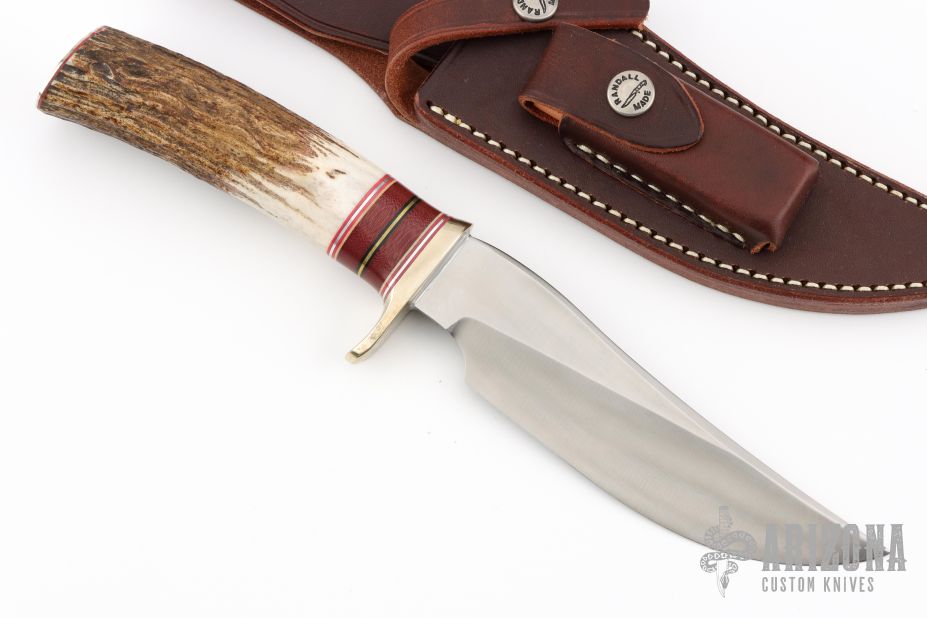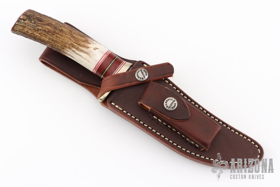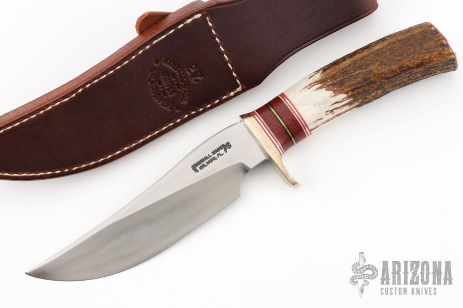 The Model 27 is an ideal all-around heavy-duty sportsman's knife. This knife has a satin finished blade with .227" blade stock and 1.443" blade depth, hidden tang construction. The handle has a nickel silver guard and butt, stag grip with red/duralumin/white/red linen micarta/black/brass spacers. Comes with a brown leather sheath and original paper wrapping. Excellent condition.